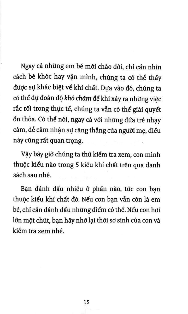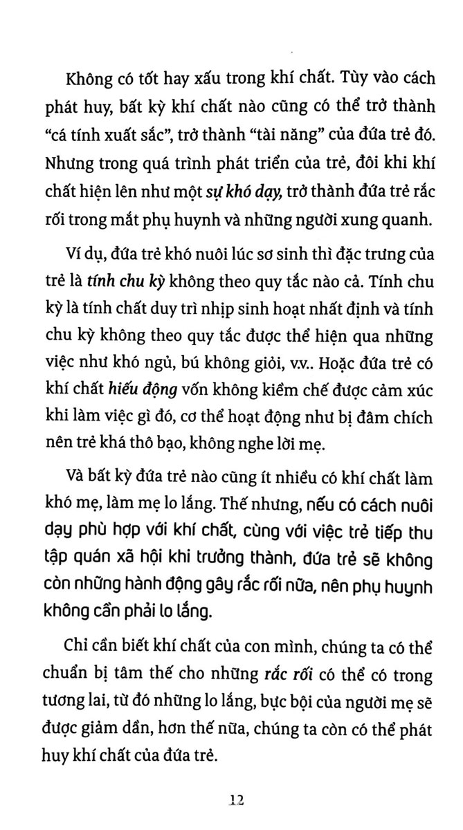 Không có khí chất tốt hay xấu. Tùy vào cách phát huy, bất kỳ khí chất nào cũng có thể trở thành “cá tính xuất sắc”, hay “tài năng” của trẻ. Sách không chỉ dành cho phụ huynh để áp dụng cho con trẻ, mà còn áp dụng cho chính người lớn. Mỗi người sẽ tìm thấy mình trong các kiểu khí chất, hiểu được những nghề nghiệp phù hợp với mình và cách ứng xử phù hợp với mình và người khác dựa trên kiểu khí chất.