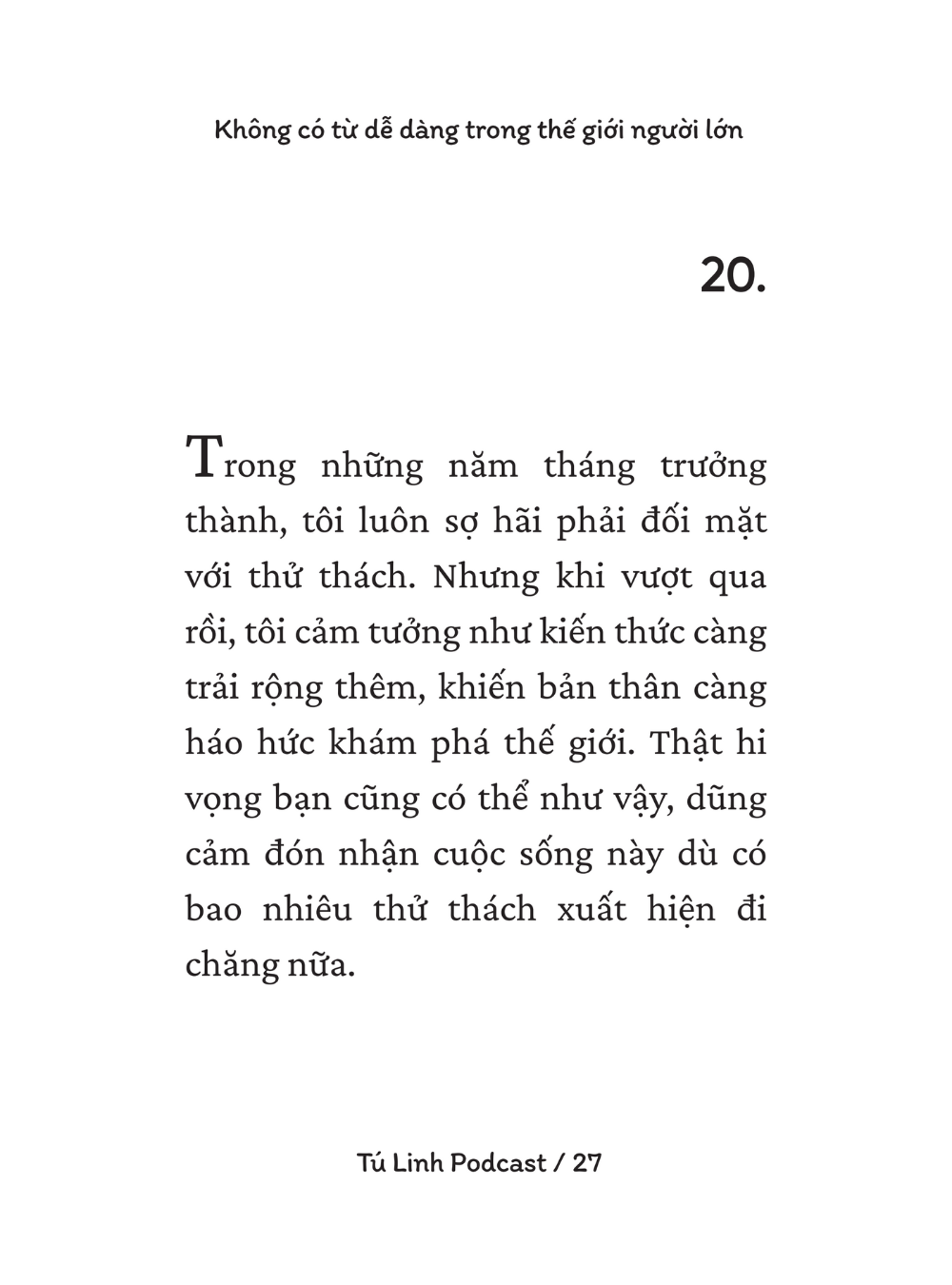 Nếu cậu đang cảm thấy cuộc sống của người trưởng thành sao khó khăn quá, vậy thì hãy để cuốn sách "Không có từ dễ dàng trong thế giới người lớn" bầu bạn cùng cậu trên hành trình này nhé!