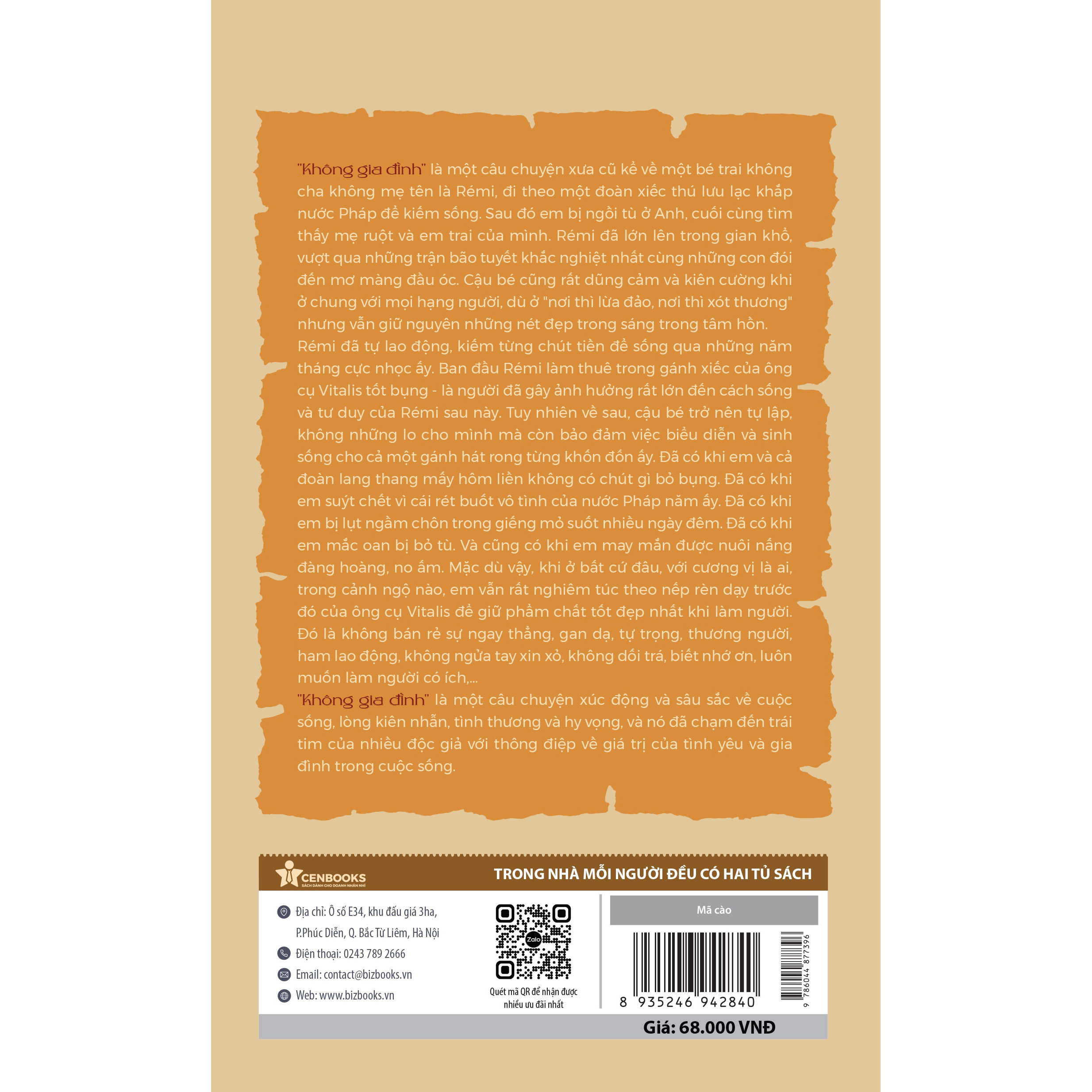 Cuốn sách Không gia đình là hành trình phiêu lưu của Remi, một câu bé mồ côi từ nhỏ. Cái tên Không gia đình gợi lên sự buồn bã, cô đơn, song, khi đọc tác phẩm, ta lại thấy được sự lạc quan, yêu đời trong từng hoàn cảnh, trong mọi tình huống, bên cạnh cậu luôn là những người tốt giúp đỡ. Một tác phẩm đã lấy đi nước mắt nhưng cũng để lại nụ cười cho nhiều độc giả dù là lớn đến bé.
