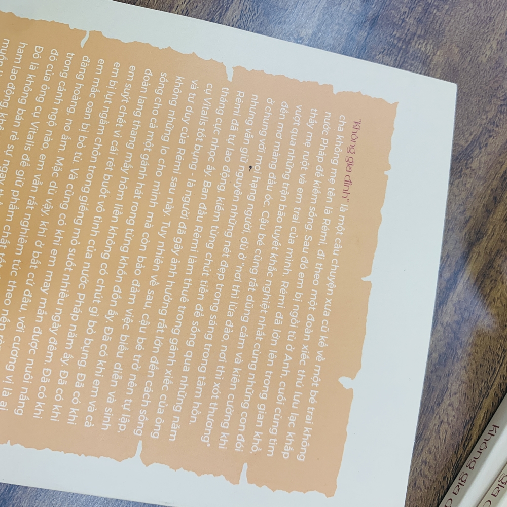 Cuốn sách Không gia đình là hành trình phiêu lưu của Remi, một câu bé mồ côi từ nhỏ. Cái tên Không gia đình gợi lên sự buồn bã, cô đơn, song, khi đọc tác phẩm, ta lại thấy được sự lạc quan, yêu đời trong từng hoàn cảnh, trong mọi tình huống, bên cạnh cậu luôn là những người tốt giúp đỡ. Một tác phẩm đã lấy đi nước mắt nhưng cũng để lại nụ cười cho nhiều độc giả dù là lớn đến bé.