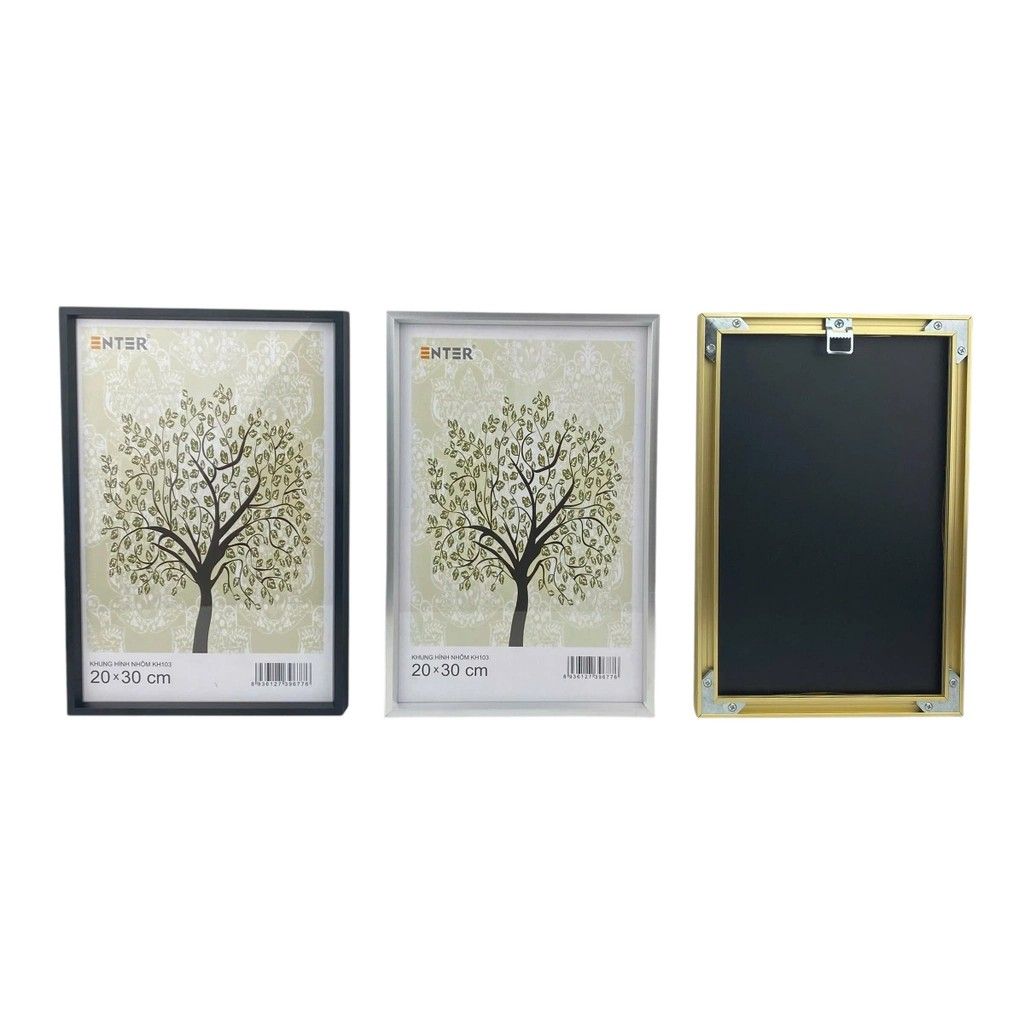 Khung hình nhôm Enter có thiết kế đơn giản với phần khung viền làm từ nhôm có 3 tone màu sắc vàng, bạc, đen phù hợp với nhiều mục đích trưng bày và sử dụng.