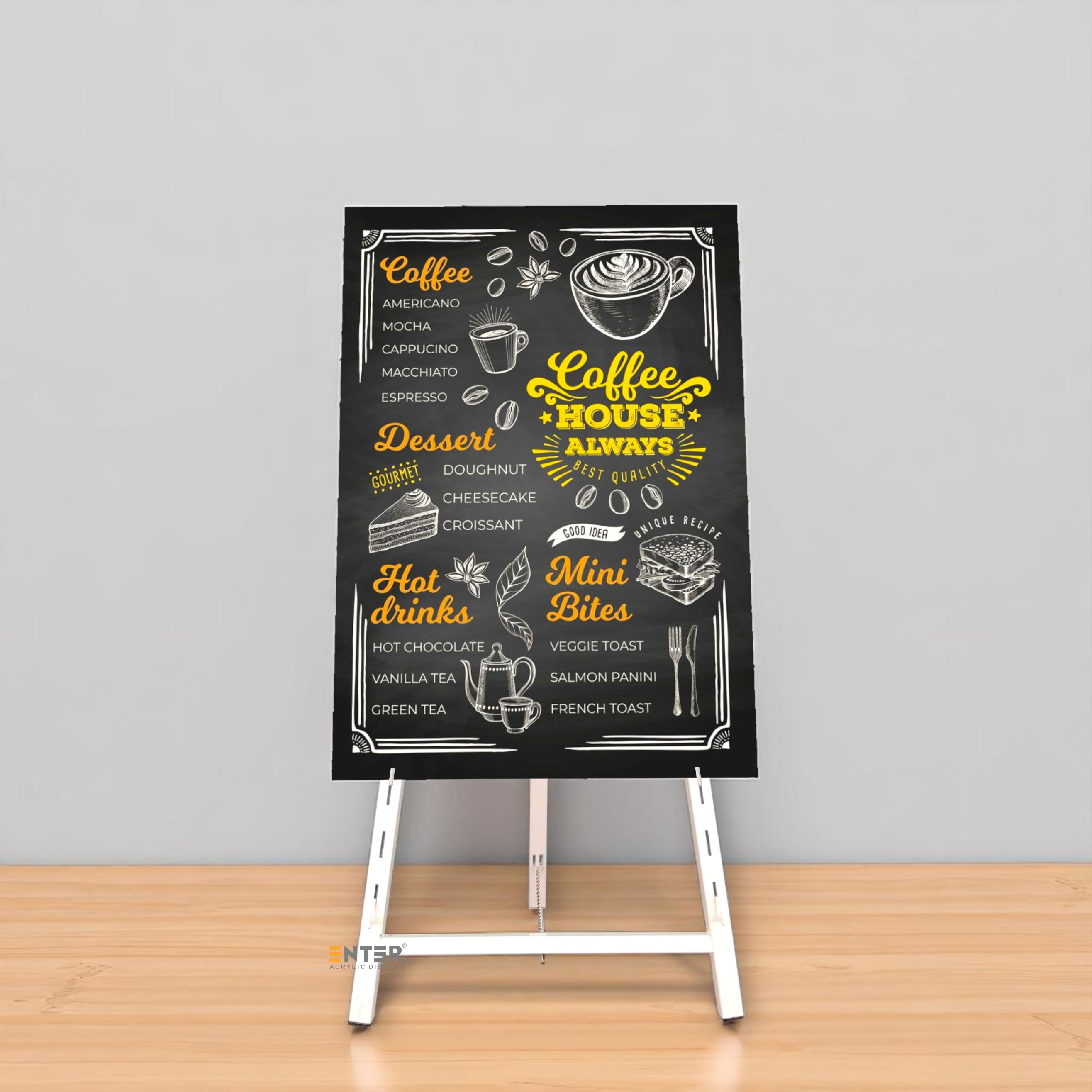 Khung vẽ - giá đỡ tranh Enter GV040 được làm bằng kim loại, bề mặt được sơn tĩnh điện với 3 tone màu đen, trắng, vàng đẹp mắt. Khung kệ có độ giày phù hợp giúp kệ có khả năng chịu tải trọng ổn định, bền bỉ.