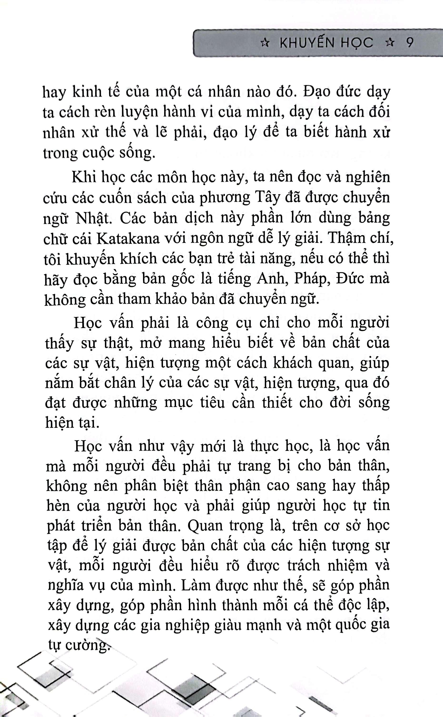 Đó là điều mà bạn sẽ tìm thấy khi chiêm ngẫm những trang của cuốn sách “Khuyến học” – một cuốn sách có ảnh hưởng vĩ đại đến người dân Nhật Bản nói riêng và những dân trên toàn thế giới nói chung – tạo ra một luồng gió mới khi nghĩ về vấn đề “học vấn”.