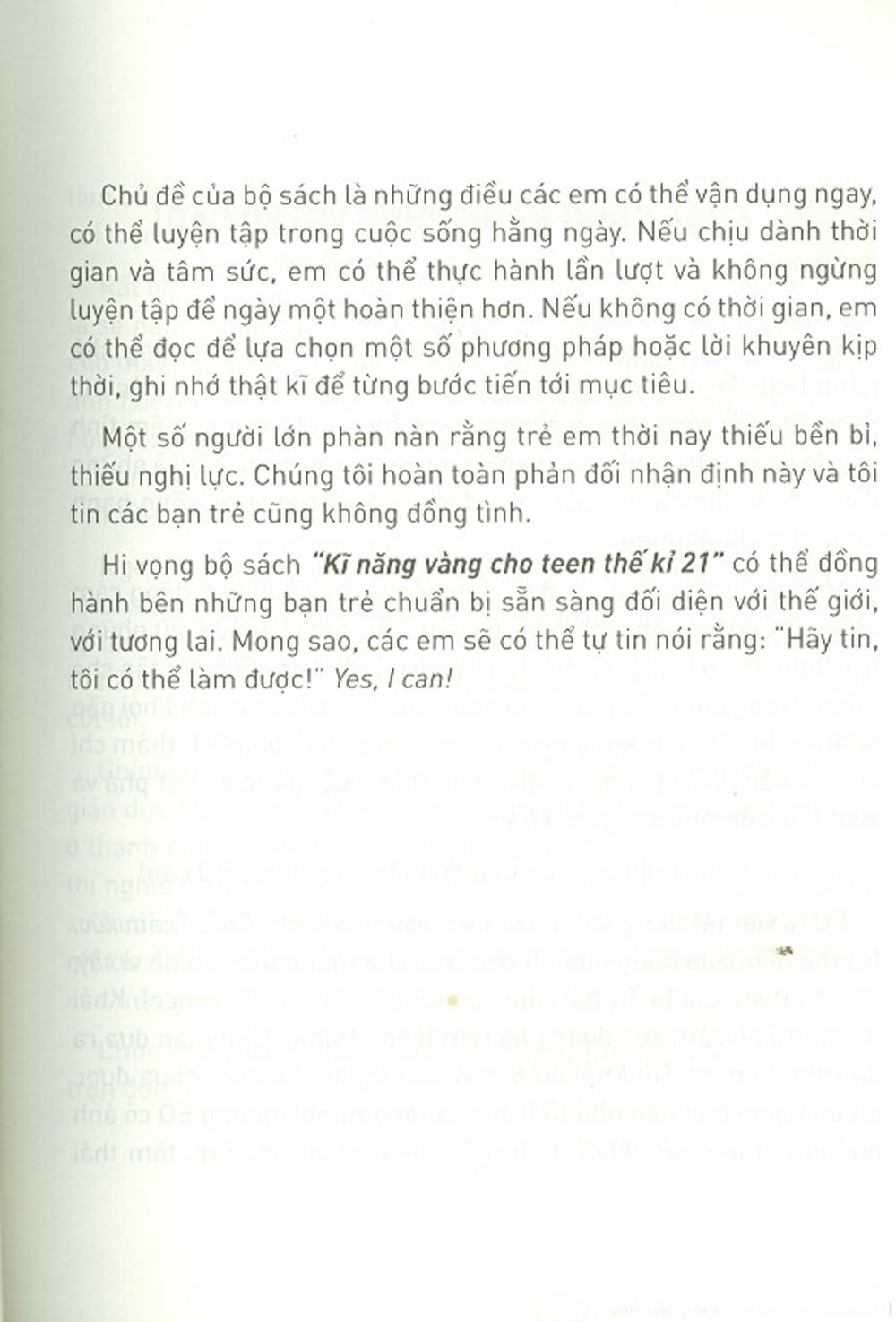 Tuổi teen là giai đoạn phát triển vô cùng lí thú. Học hỏi kiến thức, hiểu bản thân và trau dồi khả năng học tập khác nhau là nhiệm vụ quan trọng nhất của những người trẻ tuổi. Bộ sách này tập trung vào cuộc sống và tình trạng học tập của học sinh phổ thông cơ sở và phổ thông trung học, tìm ra những vấn đề mà các bạn trẻ hay gặp nhất, những kĩ năng cần thiết nhất. Các chuyên gia hàng đầu trong nhiều lĩnh vực đã xây dựng bộ sách “Kĩ năng vàng cho teen thế kỉ 21” với những nội dung và giải pháp phù hợp, để độc giả trẻ không chỉ giải quyết được những vấn đề của hiện tại, mà còn bồi đắp nền tảng cơ bản cho các hoạt động suốt đời người.