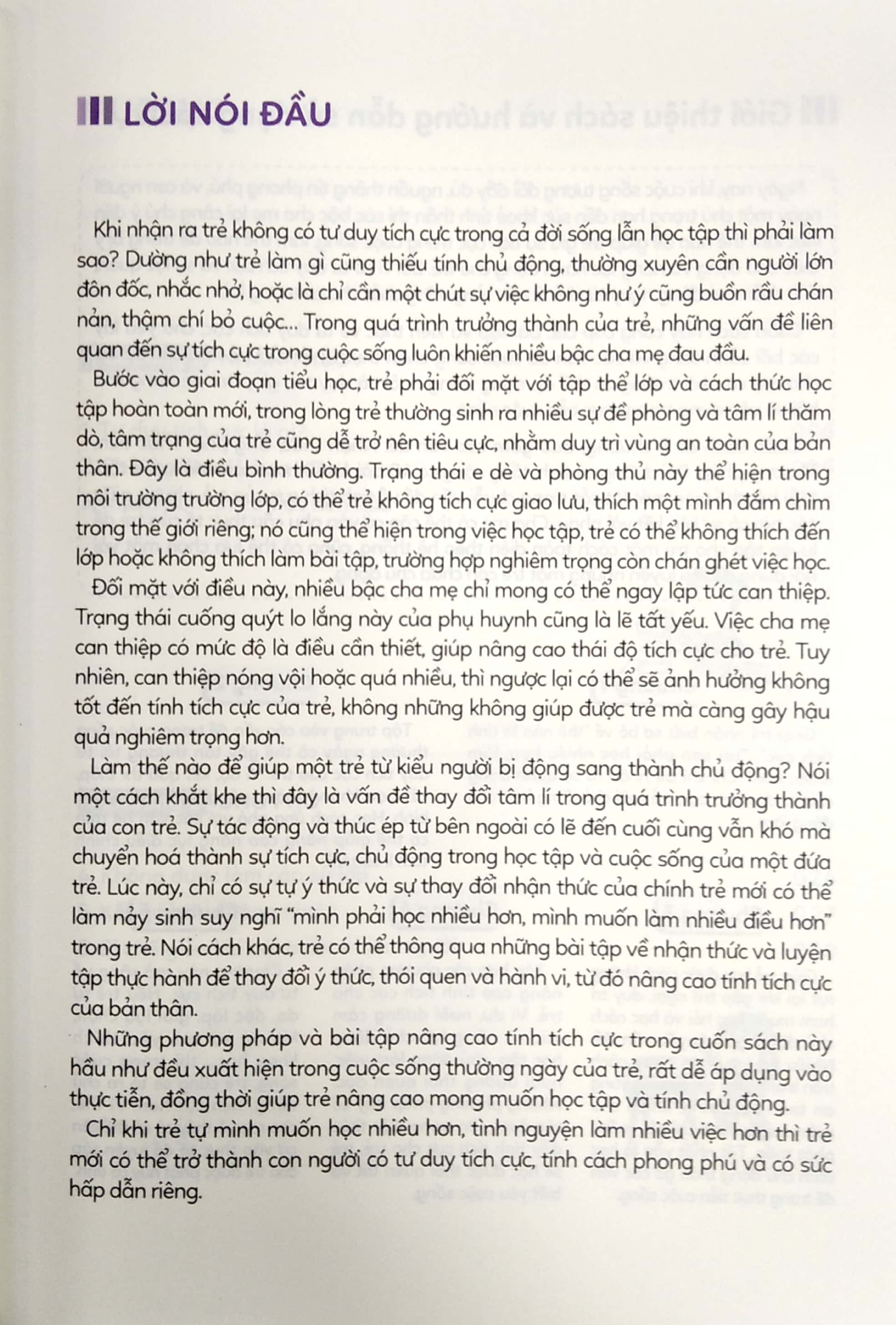 Làm thế nào để giúp trẻ chuyển từ kiểu người bị động sang chủ động? Suy cho cùng, mọi việc đều phải xuất phát từ bản thân trẻ. Tư Duy Tích Cực cung cấp 40 bài tập thực hành, tập trung vào những tình huống thường gặp trong cuộc sống, giúp trẻ tự nhận thức, rèn luyện tư duy tích cực, nâng cao tính ham học hỏi và chủ động trong cuộc sống.