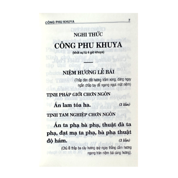 KINH NHẬT TỤNG (KHỔ NHỎ) MỤC LỤC: NGHI THỨC CÔNG PHU KHUYA NGHI THỨC CÔNG PHU CHIỀU: KINH A DI ĐÀ, HỒNG DANH SÁM HỐI, MÔNG SƠN THÍ THỰC NGHI THỨC CẦU AN NGHI THỨC TỤNG KINH KIM CANG NGHI THỨC LỄ VU LAN BỒN: KINH HẠ SANH DI LẶC THÀNH PHẬT NGHI THỨC LỄ KHÁNH ĐẢN NGHI THỨC LỄ AN VỊ PHẬT NGHI THỨC CÚNG NGỌ NGHI THỨC QUÁ ĐƯỜNG NGHI THỨC KỆ ĐẠI HỒNG CHUNG: KỆ CHUYỂN TRỐNG NGHI THỨC PHÓNG SANH CÁC BÀI SÁM: SÁM THÍCH CA, SÁM DI ĐÀ, SÁM NHỨT TÂM NGHĨA, SÁM HỐI PHÁT NGUYỆN, SÁM ĐẠI TỪ, SÁM PHÁT NGUYỆN, SÁM QUAN ÂM, SÁM NHỨT TÂM, BÀI NGUYỆN CHƯ THIÊN CÁC NGÀY LỄ KỶ NIỆM NHỮNG NGÀY TRAI