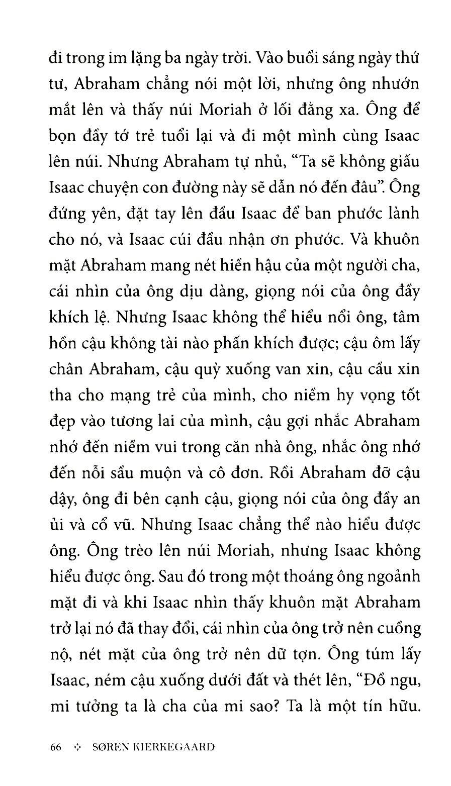 Từ câu chuyện trong Kinh Thánh Cựu Ước mô tả việc Tổ phụ Abraham tuân lệnh Thiên Chúa, sẵn sàng sát tế con trai m.ình là Isaac (thường được ngợi ca như một điển tích về sự trung thành vô điều kiện), triết gia Soren Kierkegaard triển khai ba luận đề truy vấn: liệu có tồn tại một sự đình bỏ có tính mục đích luận đối với luân lý hay không?; liệu có tồn tại một bổn phận tuyệt đối với Thượng đế hay không?; Liệu Abraham có thể biện hộ được về mặt luân lý khi che giấu mục đích của m.ình không cho Sarah, Eleazar và Isaac biết hay không?