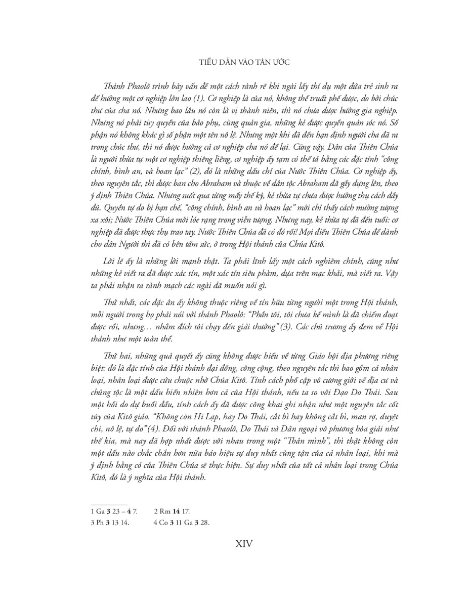 Bản tiếng Việt do Omega+ xuất bản là bản dịch của cố Linh mục Giuse Nguyễn Thế Thuấn - một học giả uyên thâm của Giáo hội Công giáo Việt Nam, lâu nay được xem là một trong những công trình dịch thuật khả tín, khoa học nhất đã từng được xuất bản bằng tiếng Việt, được giới nghiên cứu đánh giá rất cao và là nguồn tài liệu tham khảo quan trọng đối với các chủng sinh Đại Chủng viện, Học viện của các Dòng Tu…