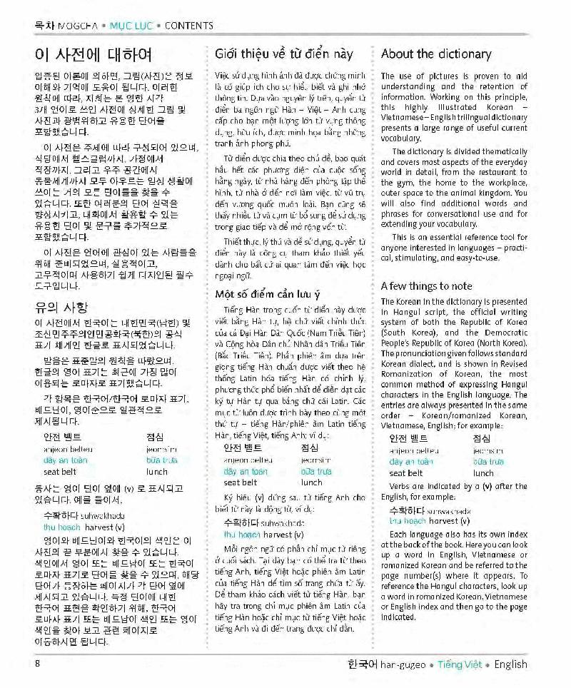 Quyển từ điển này cung cấp hơn 4.000 từ vựng (có phiên âm) thông qua 100 chủ đề liên quan đến cuộc sống thường ngày. Kèm theo hàng nghìn từ vựng đó là 2.000 hình màu minh họa để bạn dễ nhớ từ và vô số cách diễn đạt cần thiết để bạn nắm được cách dùng từ.
