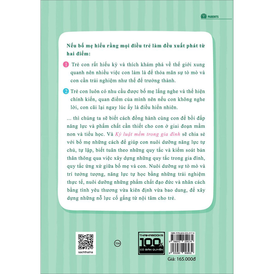 “Kỷ luật mềm trong gia đình” với cách ứng xử dựa trên 5 từ khóa “Yêu Thương - Kiên Nhẫn - Thừa Nhận - Khen Ngợi - Tin Tưởng”, bằng những câu chuyện thực tế, gần gũi và sinh động có tính ứng dụng cao, bố mẹ sẽ cảm thấy cuốn sách như đang viết cho chính mình và chính con mình. Và từ đó việc nuôi dạy con sẽ nhẹ nhàng và bình an hơn.