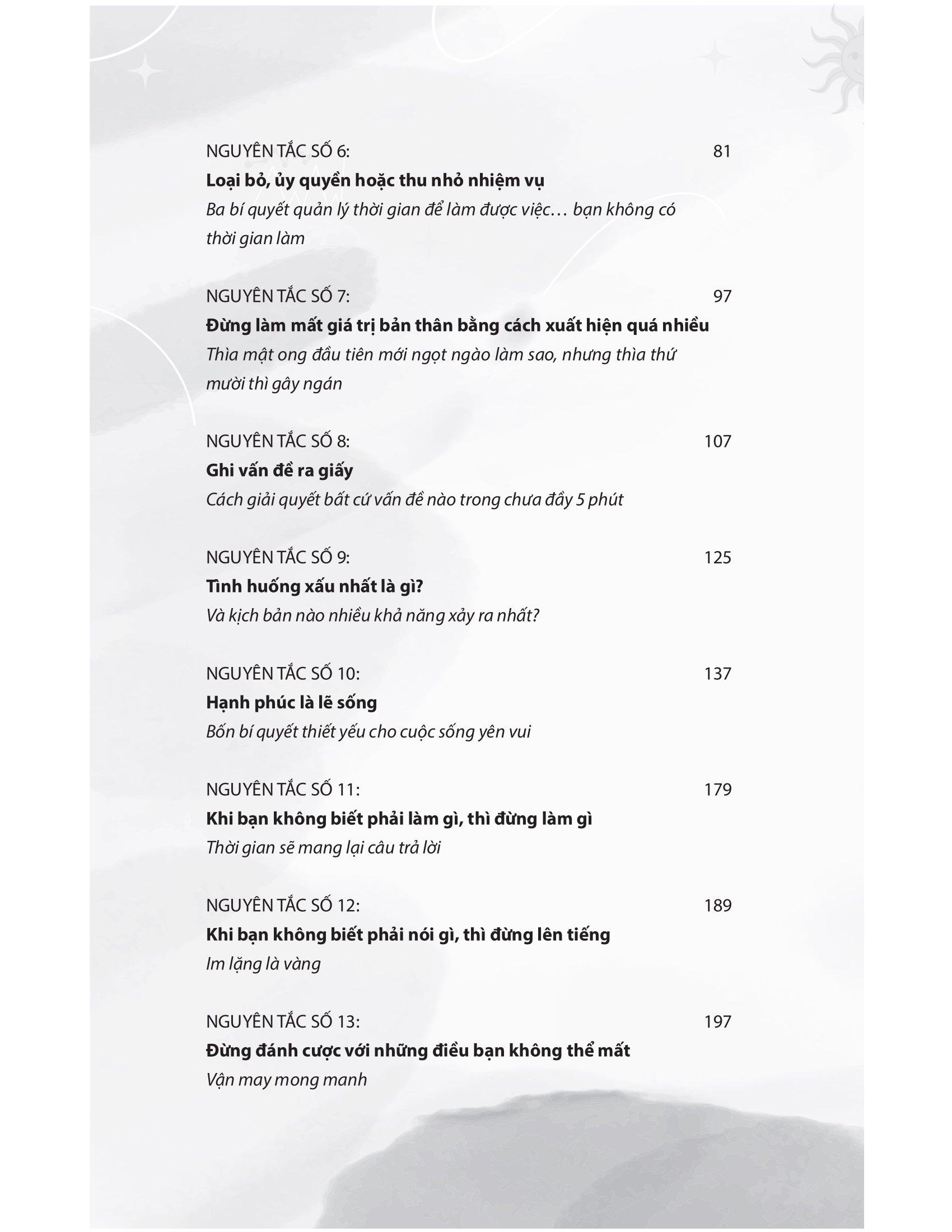 27 chương trong cuốn sách tương ứng với 27 quy tắc giúp bạn thay đổi những thói quen tiêu cực thành thói quen tích cực. Để đảm bảo sự thành công trong sự nghiệp, đạt được sự cân bằng giữa công việc và cuộc sống cũng như nâng cao sự tự tin của bạn.