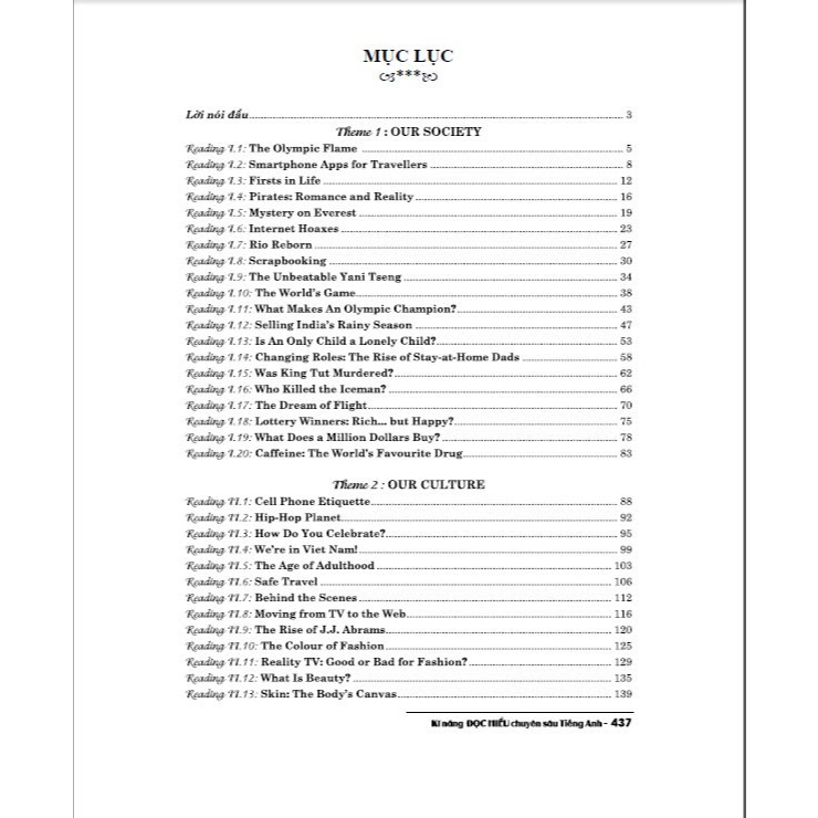Các bài đọc được chia thành những chủ đề thường gặp trong các đề thi như: Our Society (Xã hội của chúng ta); Our Culture (Nền văn hóa của chúng ta);