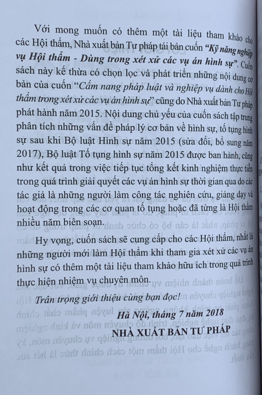 Lời giới thiệu: Với mong muốn có thêm một tài liệu tham khảo cho các Hội thẩm, Nhà xuất bản Tư pháp tái bản cuốn “Kỹ năng nghiên vụ Hội thẩm - Dùng trong xét xử các vụ án hình sự”. Cuốn sách này kế thừa có chọn lọc và phát triển những nội dung cơ bản của cuốn “Cẩm nang pháp luật và nghiệp vụ dành cho Hội thẩm trong xét xử các vụ án hình sự cũng do Nhà xuất bản Tư pháp phát hành năm 2015. Nội dung chủ yếu của cuốn sách tập trung phân tích những vấn đề pháp lý cơ bản về hình sự, tố tụng hình sự sau khi Bộ luật Hình sự năm 2015 (sửa đổi, bổ sung năm 2017), Bộ luật Tố tụng hình sự năm 2015 được ban hành, cũng như kết quả trong việc tiếp tục tổng kết kinh nghiệm thực tiễn trong quá trình giải quyết các vụ án hình sự thời gian qua do các tác giả là những người làm công tác nghiên cứu, giảng dạy và hoạt động trong các cơ quan tố tụng hoặc đã từng là Hội thẩm nhiều năm biên soạn. Hy vọng, cuốn sách sẽ cung cấp cho các Hội thẩm, nhất là những người mới làm Hội thẩm khi tham gia xét xử các vụ án hình sự có thêm một tài liệu tham khảo hữu ích trong quá trình thực hiện nhiệm vụ chuyên môn.