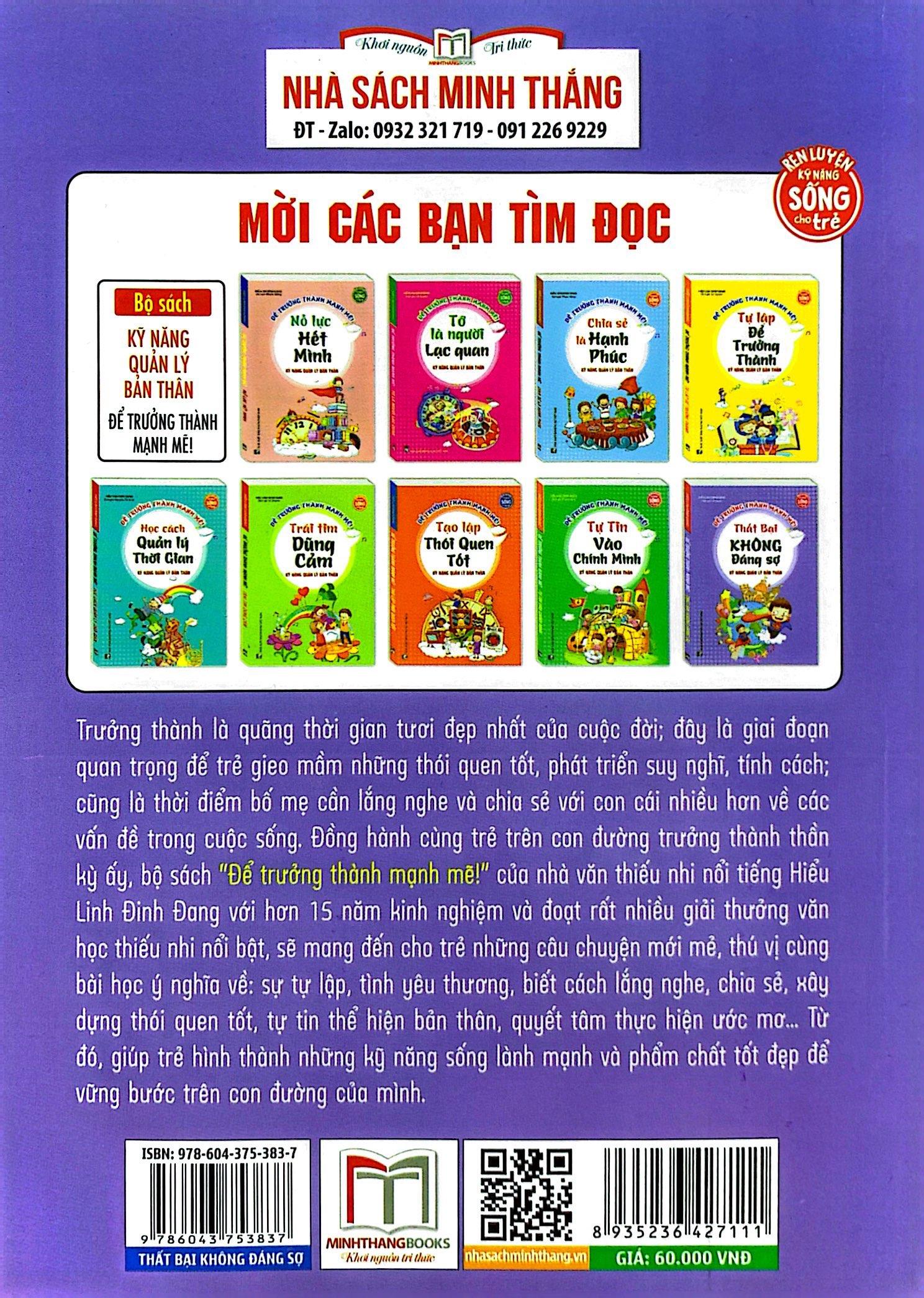 Trưởng thành là quãng thời gian tươi đẹp nhất của cuộc đời , đây là giai đoạn quan trọng để trẻ gieo mầm những thói quen tốt , phát triển suy nghĩ , tính cách ; cũng là thời điểm bố mẹ cần lắng nghe và chia sẻ với con cái nhiều hơn về các vấn đề trong cuộc sống . Đồng hành cùng trẻ trên con đường trưởng thành thần kỳ ấy , bộ sách "Để trường thành mạnh mẽ!" của nhà văn thiếu nhi nổi tiếng Hiểu Linh Đinh Đang với hơn 15 năm kinh nghiệm và đoạt rất nhiều giải thưởng văn học thiếu nhi nổi bật , sẽ mang đến cho trẻ những câu chuyện mới mẻ , thú vị cùng bài học ý nghĩa về : sự tự lập , tình yêu thương , biết cách lắng nghe , chia sẻ , Từ đó , giúp trẻ hình thành những kỹ năng sống lành mạnh và phẩm chất tốt đẹp để vững bước trên con đường của mình .