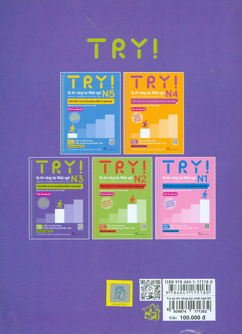 Mua tại TiktokBộ giáo trình TRY! gồm một cuốn TRY! Start cho các bạn mới bắt đầu học tiếng Nhật và 5 cuốn TRY! N1, N2, N3, N4, N5 giúp phát triển các kỹ năng tiếng Nhật thông qua việc học ngữ pháp. Bộ giáo trình này là tài liệu luyện thi thiết thực cho "Kỳ thi năng lực Nhật ngữ" các cấp độ từ N5 đến N1, giúp người học nắm chắc các điểm ngữ pháp và vận dụng chúng thông qua các bài luyện tập Nghe - Đọc.