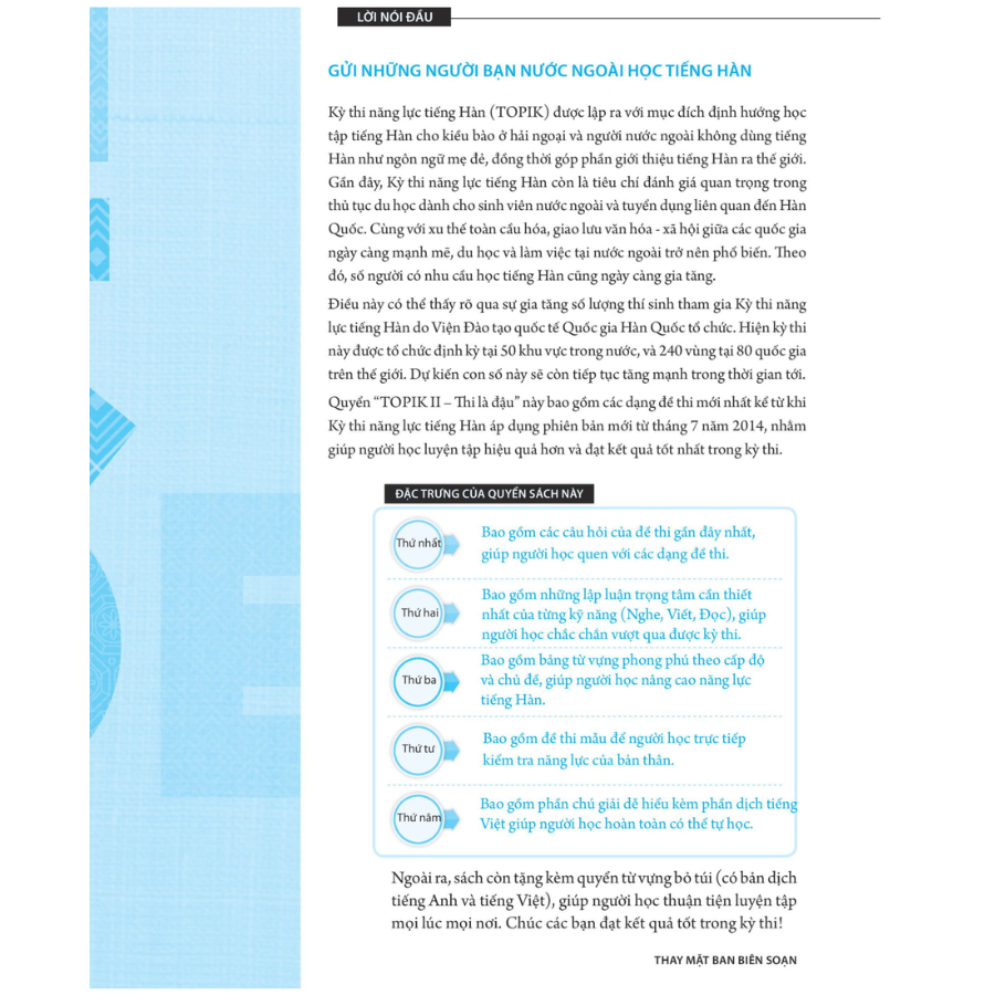“TOPIK II - Thi là đậu” là giáo trình cập nhật mới nhất về kỳ thi và các dạng đề TOPIK II. Giáo trình cũng đáp ứng đầy đủ nhất yêu cầu của người muốn học thi TOPIK, với những nội dung “Bí quyết giải đề”, “Giải thích Từ vựng và Ngữ pháp”, “Đề thi từng ra”, “Đề mẫu”, và “Chú giải”. Ngoài ra còn có “Sổ tay từ vựng” TOPIK với 3 ngôn ngữ Hàn, Anh, Việt chỉ có duy nhất trong giáo trình này.