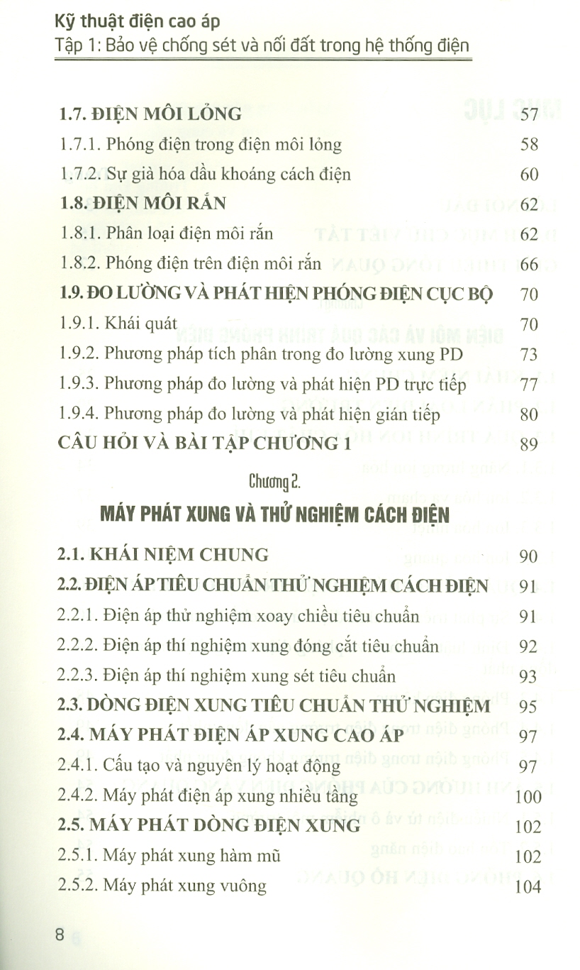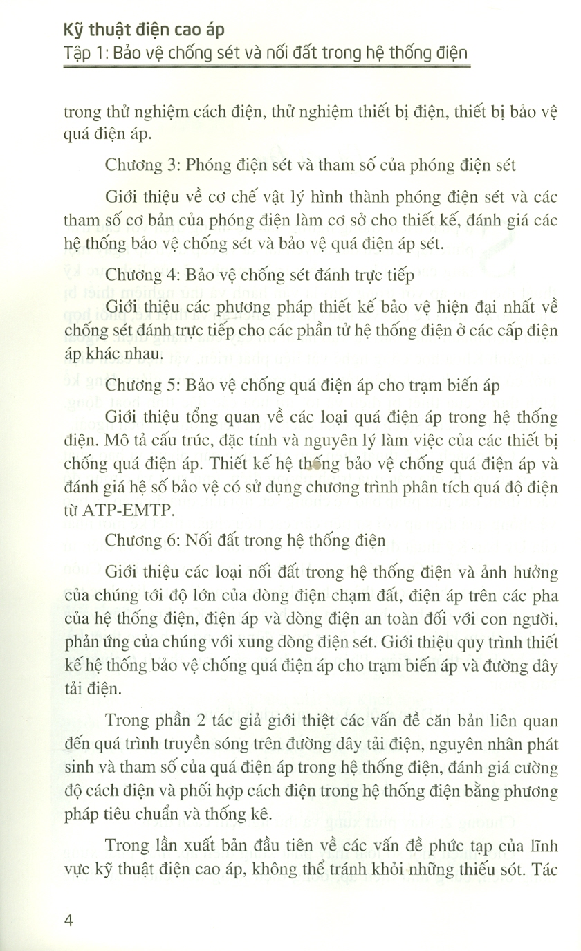 Cuốn sách cung cấp phạm vi bao quát về cơ sở vật lý của các quá trình phóng điện, ứng suất và cường độ cách điện, các giải pháp bảo vệ chống sét, nối đất,