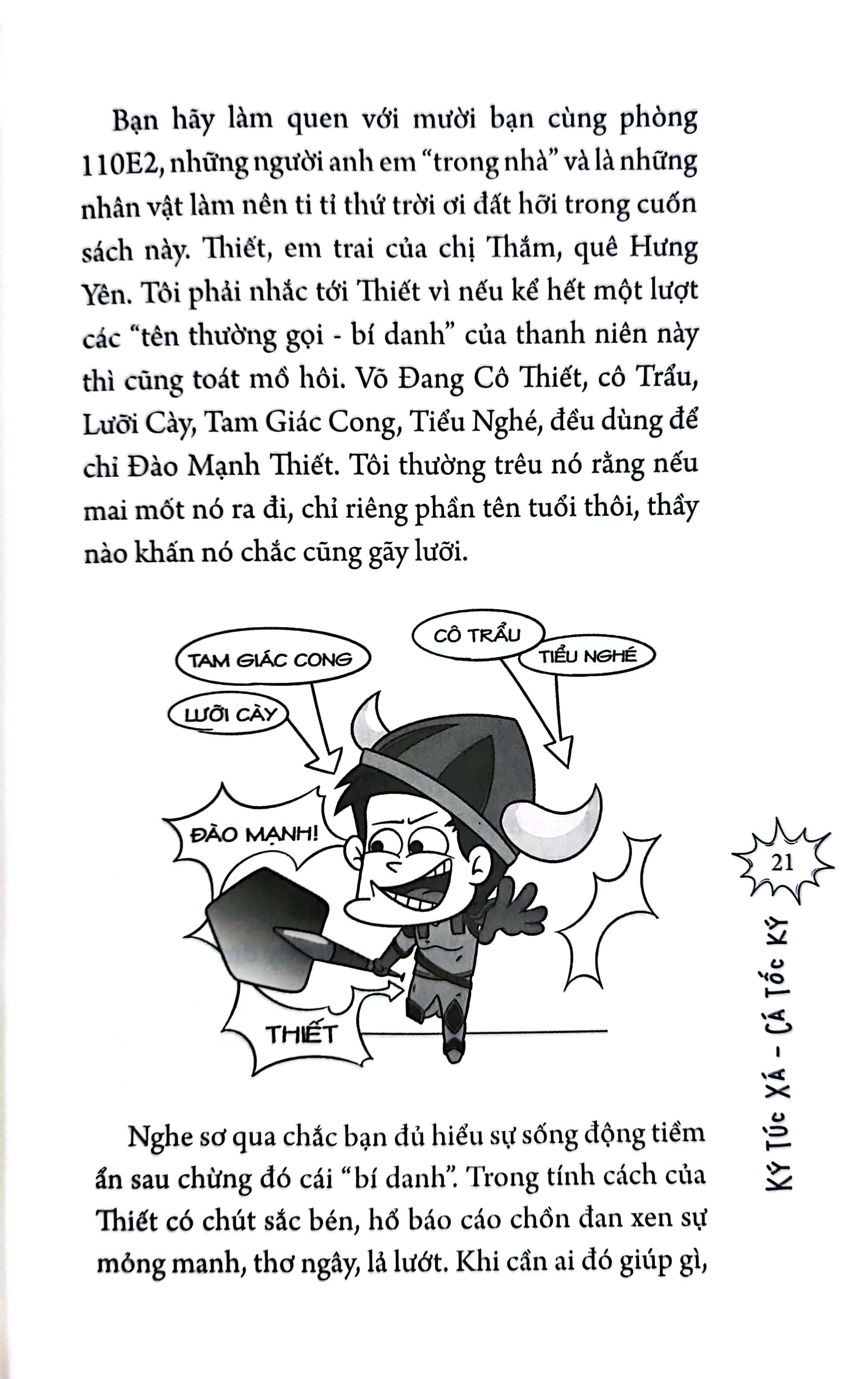 Sở dĩ tôi mong muốn được viết tới vậy, vì phòng ký túc xá của chúng tôi khá đặc biệt khi sở hữu toàn nhân vật “quái dị” với những câu chuyện không đầu, không cuối và luôn được chúng tôi hào hứng nhắc lại mỗi lần họp phòng. Nguyên tắc hoạt động của phòng gần giống như cách mà tôi có được những dòng này vậy đó: đề đạt nguyện vọng đầy lịch sự, nếu không được đồng ý thì tự m.ình hành sự. Thế mà chừng ấy con người vẫn chung sống và tu luyện hòa thuận suốt 6 năm trong “ngôi nhà chung” (thuật ngữ trích từ Việt Nam Nếch - tóp - mo - đồ), với chỉ đôi ba lần sứt đầu mẻ trán. Ở đó, 110E2 được lãnh đạo bởi một “cô” Thiết phó phòng quyền lực nhưng nói không đi đôi với làm; một “thánh” Vượng chuẩn mực trong lối sống và học hành; một cậu Đạt thích tâm linh; một ông Hoàng Béo đam mê lịch sử và hay hờn dỗi; một Hùng – trưởng phòng “danh dự” trang bị toàn diện bộ kĩ năng sống; một cậu Thình hết m.ình với ngôn ngữ học; một cậu Dũng thích kể chuyện nhạt; một cậu bé Tuyên thích cười duyên khiêu khích; một bạn Thế hiền lành sao cũng được; và chúng tôi nữa, cặp bài trùng Minh Cá và Hoàng Còm sở hữu bộ lưỡi bán cả thiên hạ. Tất nhiên, sự biến động nhân sự trong 6 năm học là không tránh khỏi. Những sự bổ sung chất lượng như: em Ba Duy bóng bẩy giàu lòng trắc ẩn, ông em Thanh mọt sách, ông anh Bình cam chịu hay ông anh Khánh nghệ sĩ… Tất cả những con người ấy hòa thanh hoàn hảo như bản nhạc hiệu của chương trình Gặp nhau cuối tuần mỗi khi tôi nghĩ về.
