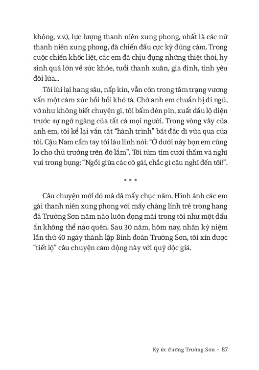 Ký ức đường Trường Sơn là tập bút ký gồm 16 bài, phát họa khá sinh động các bức tranh toàn cảnh con đường huyền thoại trong những năm chiến tranh ác liệt. Có mặt từ vị chính ủy nổi tiếng – Đặng Tính đến cán bộ, chiến sĩ bộ đội phòng không, công binh, lái xe, quân y, thanh niên xung phong, dân quân, tự vệ và quần chúng nhân dân. Mỗi câu chuyện là một kỷ niệm sâu sắc của tác giả, nhưng hết thảy đều lóng lánh khí phách anh hùng và bản chất cao đẹp của những con người ưu tú. Gian khổ, khó khăn vô bờ bến, cuộc đọ sức, sự hy sinh diễn ra từng giờ từng phút… sự tổn thất, mất mát không thể đếm đo… nhưng ở đâu, lúc nào cũng thấy lạc quan, yêu đời, sự thông minh, sáng tạo, tình yêu, tình bạn nồng thắm, tình quân dân đậm đà cá nước.