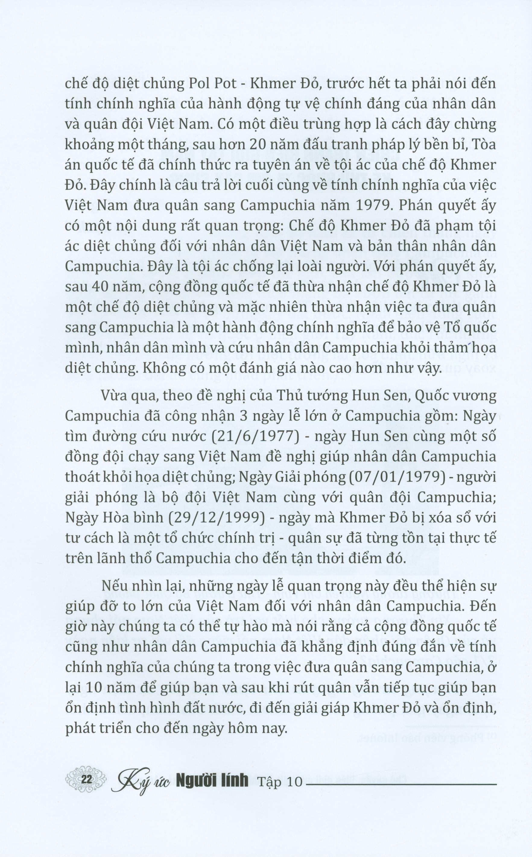 Cùng bạn đọc Đã 40 năm trôi qua, một khoảng thời gian đủ dài để chúng ta nhìn lại hai cuộc chiến tranh chống quân xâm lược bảo vệ biên giới ở hai đầu đất nước. Đó là cuộc chiến tranh bảo vệ biên giới Tây Nam, đồng thời cứu giúp đất nước Campuchỉa thoát khỏi họa diệt chủng của bọn Khmer Đỏ và cuộc chiến tranh bảo vệ biên giới phía Bắc của Tổ quốc do các thế lực cường quyền, bành trướng bên kia biên giới phát động. Nhân dân Việt Nam rất yêu chuộng và luôn khát vọng được sống trong hòa bình, nhưng “kẻ thù buộc ta ôm cây súng”. Thực tế, “Tiếng súng đã vang trên bầu trời biên giới; Gọi toàn dân ta vào cuộc chiến đấu mới; Lửa đã cháy và máu đã đổ trên khắp dải biên cương”, ở những thời khắc lịch sử đó, nhân dân và các lực lượng vũ trang cả nước đều sục sôi khí thế chống giặc ngoại xâm để bảo vệ Tổ quốc như một biểu tượng sáng ngời về ý chí, quyết tâm bảo vệ độc lập, thống nhất và toàn vẹn lãnh thổ của đất nước trong thời đại Hồ Chí Minh. Nhân dịp kỷ niệm 40 năm chiến thắng trong cuộc chiến tranh bảo vệ biên giới Tây Nam (ngày 7/01/1979-7/01/2019) và 40 năm cuộc chiến tranh bảo vệ biên giới phía Bắc Tổ quốc (17/2/1979- 17/2/2019), chúng tôi xin giới thiệu với bạn đọc cuốn sách Ký ức người lính tập 10. Tập sách đăng tải những ký ức của một thời oanh liệt mà những người con đất Việt trải qua với những năm tháng chiến tranh bảo vệ Tổ quốc đầy gian khổ, mất mát, hy sinh và rất hào hùng. Đồng thời, tôn vinh những đồng bào, chiến sĩ đã từng chiến đấu, phục vụ chiến đấu để bảo vệ từng tấc đất biên cương của Tổ quốc. Từ đó giáo dục truyền thống yêu nước, niềm tự hào dân tộc và lòng biết ơn sâu sắc của nhân dân ta, đặc biệt là thế hệ trẻ đối với các thế hệ cha anh đã không tiếc tuổi thanh xuân và xương máu để bảo vệ nền độc lập và toàn vẹn lãnh thổ của quốc gia, dân tộc. Những bài viết do những người trong cuộc tự viết ra hoặc kể lại là những câu chuyện có thật gắn với những địa danh cụ thể và một số ảnh, tư liệu của phóng viên. Những câu chuyện đó, để lại trong ta những suy ngẫm về sự mưu trí, lòng dũng cảm và sự hy sinh cao cả của đồng bào các tỉnh biên giới, cán bộ chỉ huy các cấp, chiến sĩ quân đội, dân quân tự vệ, công an vũ trang, thanh niên xung phong, lực lượng an ninh, cán bộ các ngành y tế, giáo dục, báo chí, đội ngữ văn nghệ sĩ khắc phục khó khăn để góp phần đánh bại kẻ thù xâm lược.
