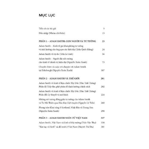 Cùng với đó là phần Phụ lục trích dịch 2 tác phẩm quan trọng nhất của ông - Sự phồn vinh của các quốc gia và Lý thuyết về tình cảm đạo đức. Trong gần 600 trang sách, các tác giả đã phác họa lại cuộc đời, bối cảnh lịch sử thời Adam Smith sinh sống, những yếu tố góp phần hun đúc nên tư tưởng quan trọng của ông; bên cạnh đó, các tác giả đã phóng chiếu, bàn sâu về sự ảnh hưởng của ông lên lý thuyết kinh tế thế giới, cho thấy tư tưởng vượt thời cùng những cấp tiến bên trong bộ óc lỗi lạc.