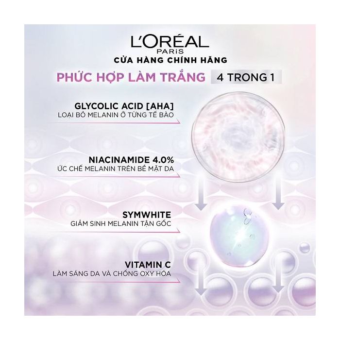- Sản xuất tại: Trung Quốc GIỚI THIỆU SẢN PHẨM • Kem Dưỡng Da Mờ Thâm Nám Ban Đêm L'Oreal Glycolic Bright Glowing Cream Night 50ml với sự nâng cấp thành phần Glycolic Acid (AHA) làm mờ các đốm nâu và sáng da sau 14 ngày sử dụng. CÔNG DỤNG • Glycolic Acid Glycolic Acid có trọng lượng phân tử nhỏ nhất trong nhóm AHA, giúp thẩm thấu sâu hơn và làm sạch tế bào da chết nhẹ nhàng trên bề mặt da giúp hỗ trợ quá trình tái tạo da, cho làn da trông tươi sáng, rạng rỡ hơn. 4 TÁC ĐỘNG LÀM SÁNG DA: