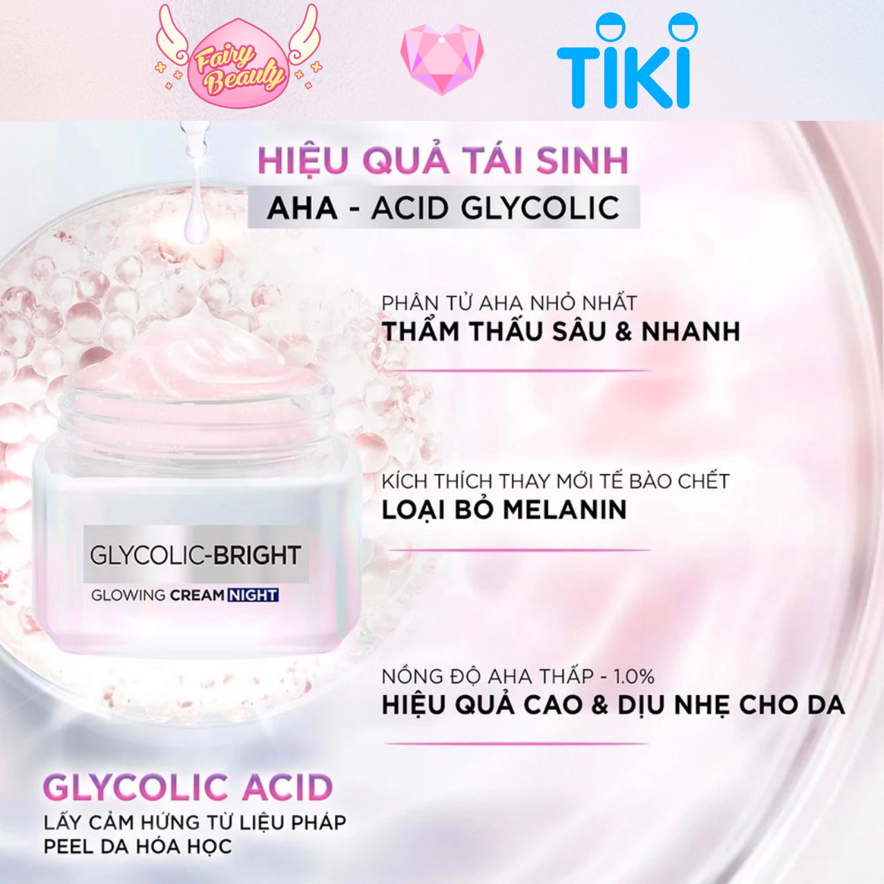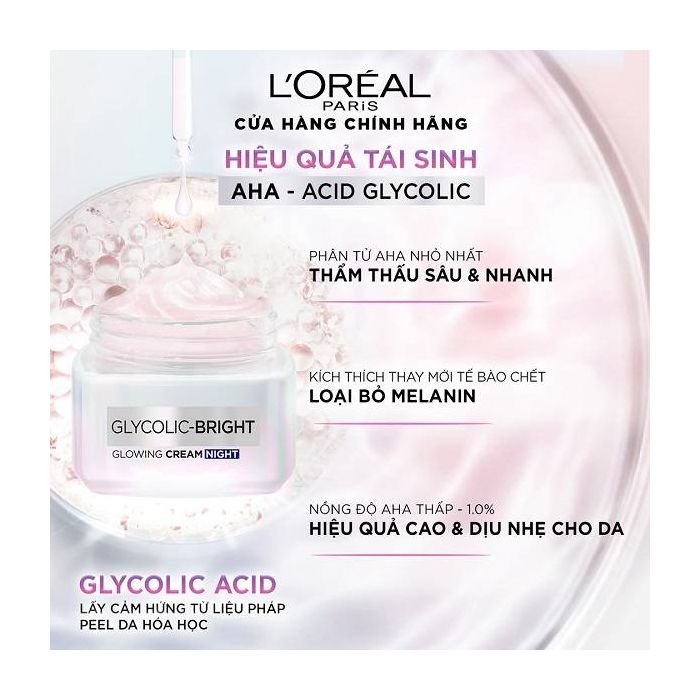 ĐẠI LÝ CHÍNH THỨC L'OREAL PARIS VIỆT NAM KEM DƯỠNG BAN ĐÊM AHA GIÚP MỜ THÂM NÁM VÀ CẤP ẨM TỐI ƯU L'OREAL PARIS GLYCOLIC BRIGHT GLOWING CREAM NIGHT 50/15/7.5ML