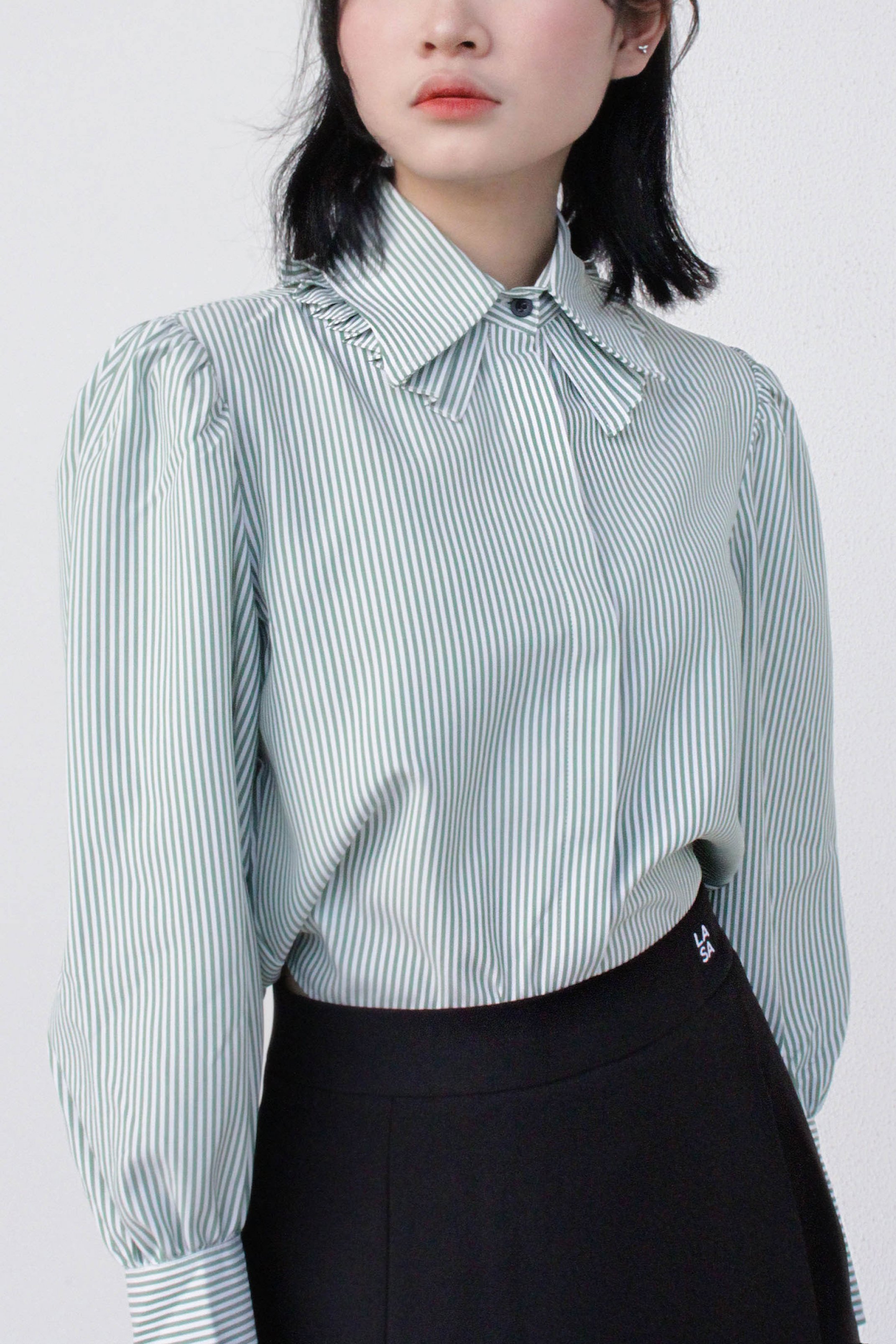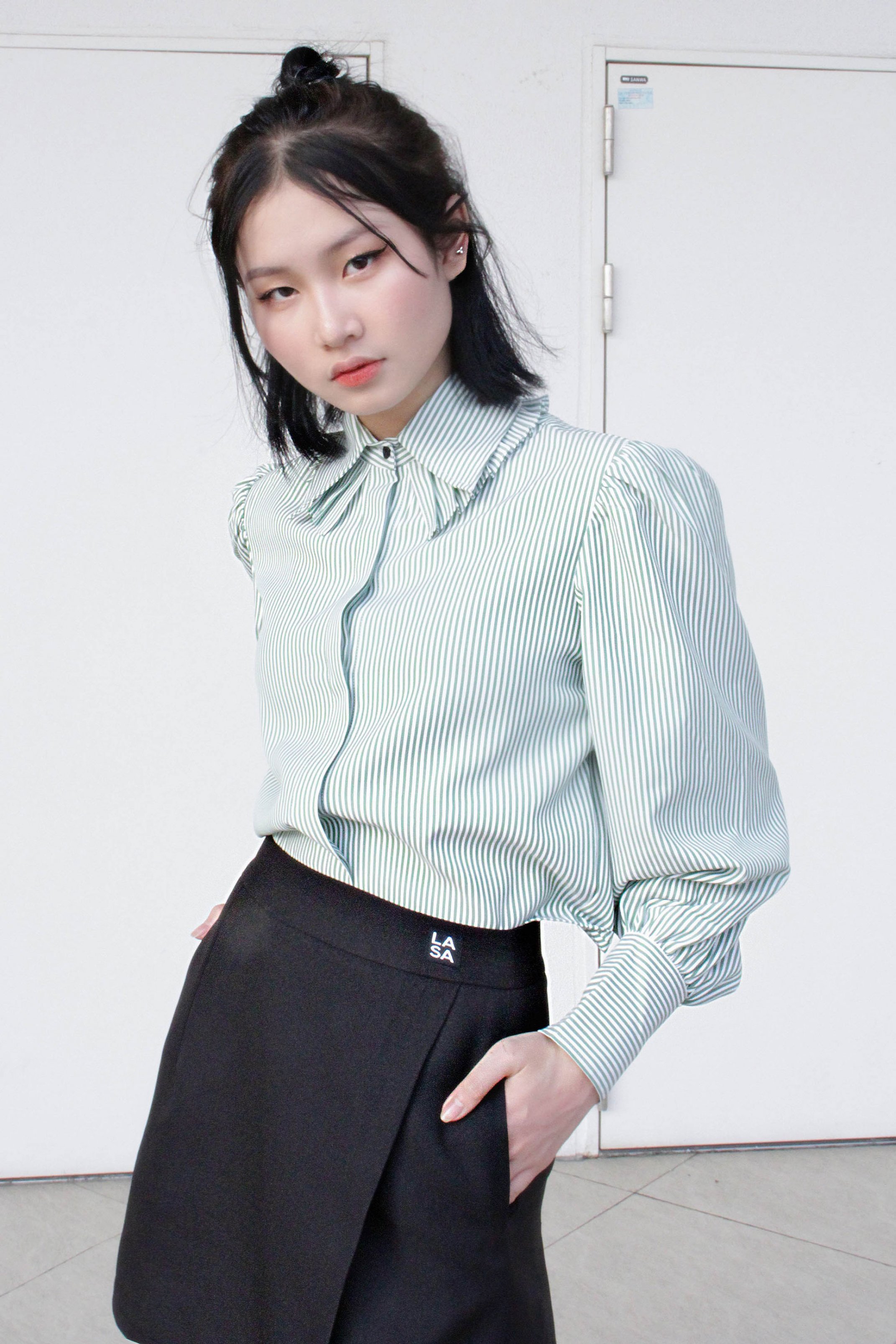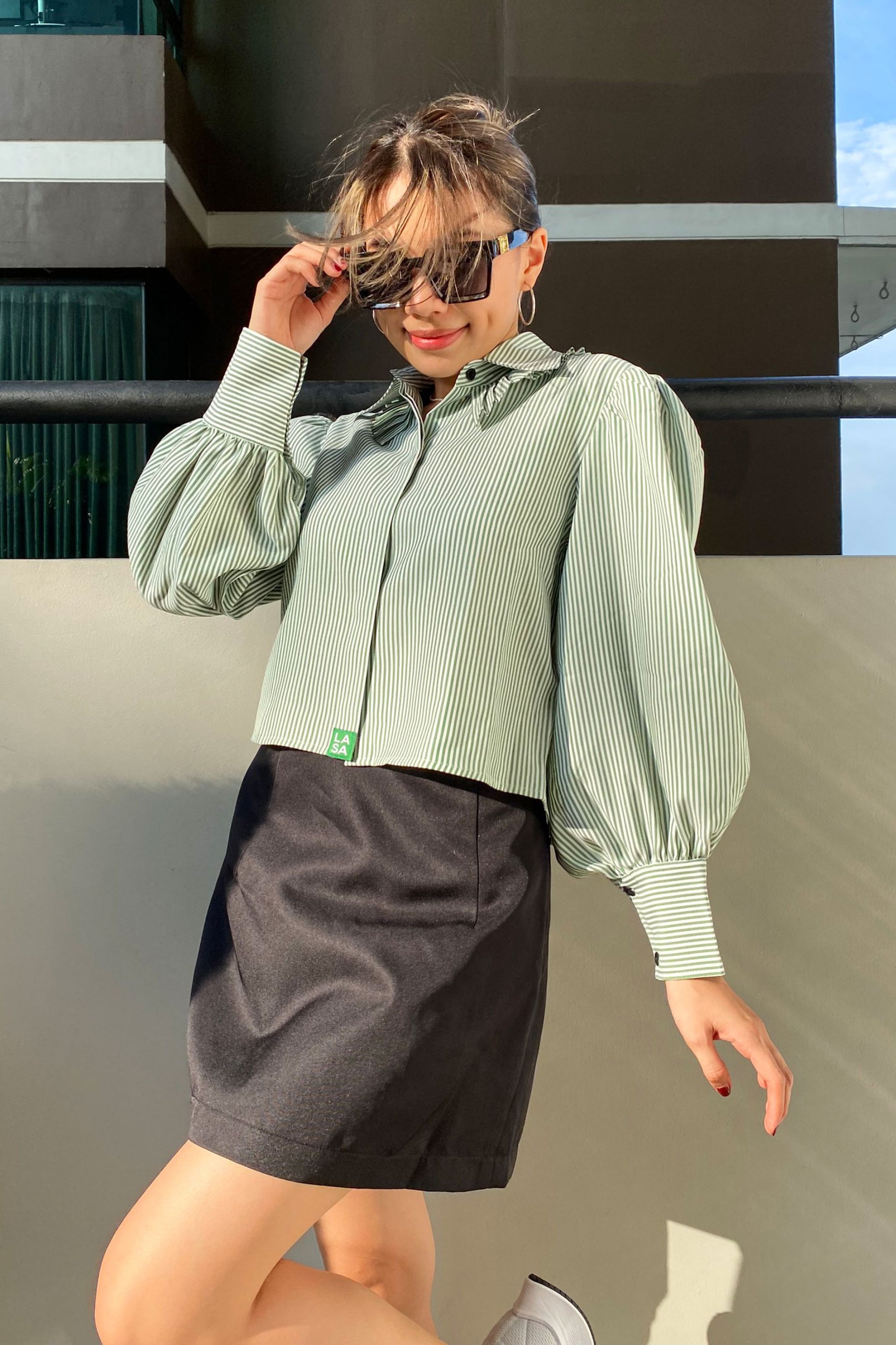 CHẤT SOMI COTTON PHA, MỀM ĐỨNG PHOM ÁO MÀU XANH LÁ SỌC TRẮNG ÁO CỔ SOMI KIỂU, TAY PHỒNG, NẸP ÁO GIẤU NÚT PHOM ÁO CROPTOP ĐIỂM NHẤN PHẦN XẾP LY Ở LÁ CỔ PHẦN DƯỚI, TẠO THÀNH LÁ CỔ 2 LỚP CÁCH ĐIỆU