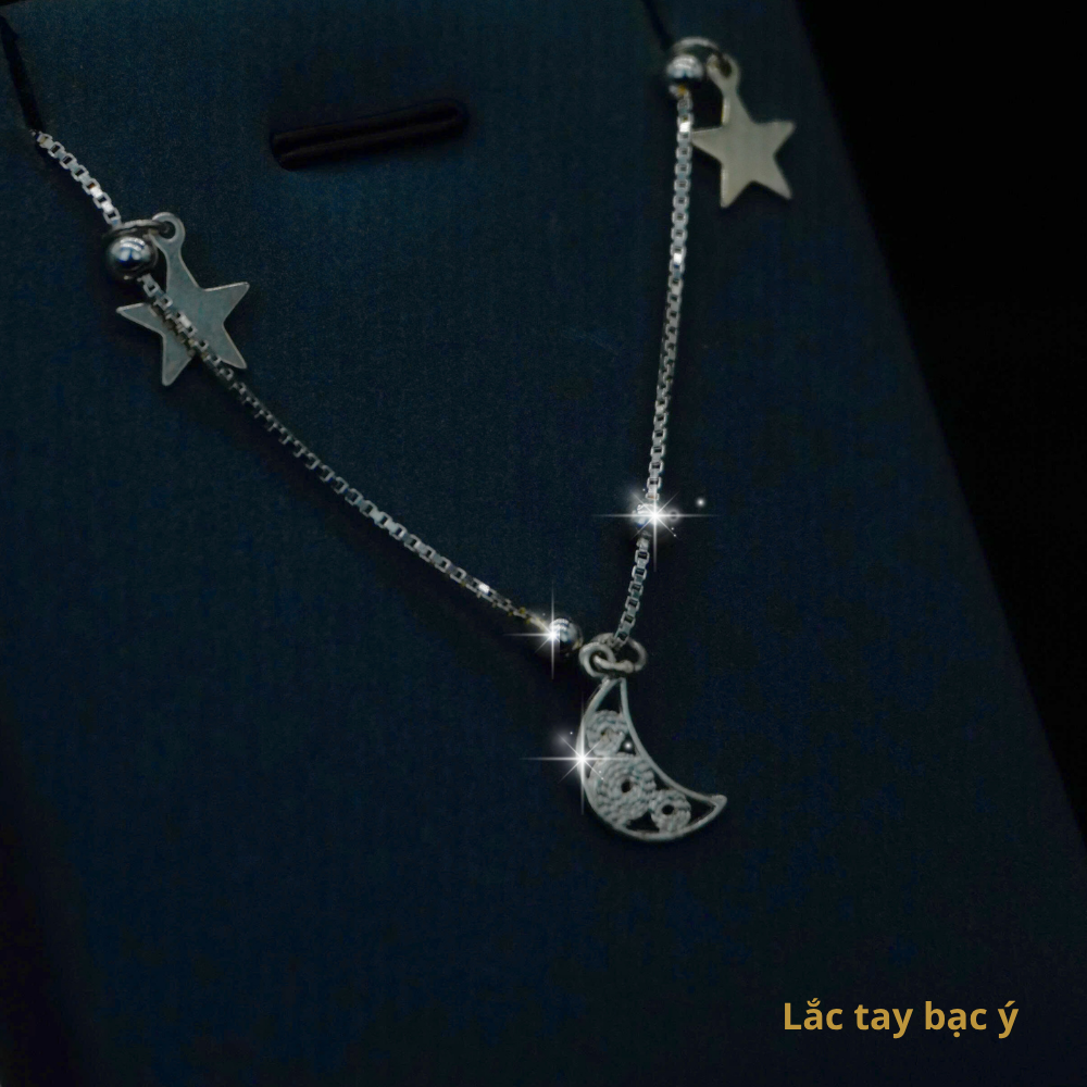 Đặc điểm: Đây là một chiếc lắc chân (ankle bracelet) bạc Ý với thiết kế thanh mảnh và các họa tiết biểu tượng độc đáo. Chiếc lắc chân có dạng dây mắt xích nhỏ, được trang trí bằng ba mặt charm treo: hai ngôi sao năm cánh và một mặt trăng lưỡi liềm. Các ngôi sao có vẻ trơn bóng, trong khi mặt trăng lưỡi liềm có thể được chạm khắc hoặc có họa tiết nổi tinh xảo trên bề mặt. Các hạt bạc nhỏ được xen kẽ trên dây, tạo điểm nhấn và sự mềm mại cho tổng thể. Chiếc lắc chân có móc khóa và phần dây điều chỉnh độ dài.
