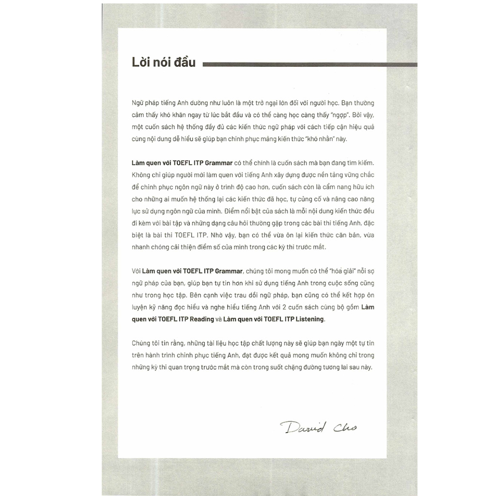 Làm quen với TOEFL ITP Grammar là cuốn sách học ngữ pháp nằm trong bộ sách Làm quen với TOEFL ITP do Gamma xuất bản. Đúng như tên gọi, cuốn sách dành cho người mới bắt đầu học tiếng Anh với mong muốn trau dồi kiến thức từ cơ bản đến nâng cao để có thể chinh phục những bài thi học thuật, đặc biệt là bài thi TOEFL ITP. Cuốn sách được sắp xếp khoa học, với 18 chương bài học được chia thành 4 phần: cấu trúc câu, từ loại, cụm từ và mệnh đề, và cấu trúc ngữ pháp, sẽ giúp người học nắm bắt hệ thống ngữ pháp một cách chính xác và tự củng cố kiến thức đã học thông qua các câu hỏi và bài tập đa dạng đi kèm. Bên cạnh các kiến thức về ngữ pháp, sách còn khai thác và phân tích các câu hỏi thường xuyên xuất hiện trong bài thi, tổng hợp các lỗi sai mà người học có thể gặp phải ở bài thi thực tế. Ngoài ra, ở cuối sách sẽ là phần đáp án, dịch nghĩa, giải thích chi tiết các dạng câu hỏi để người học tự kiểm tra kiến thức của bản thân.