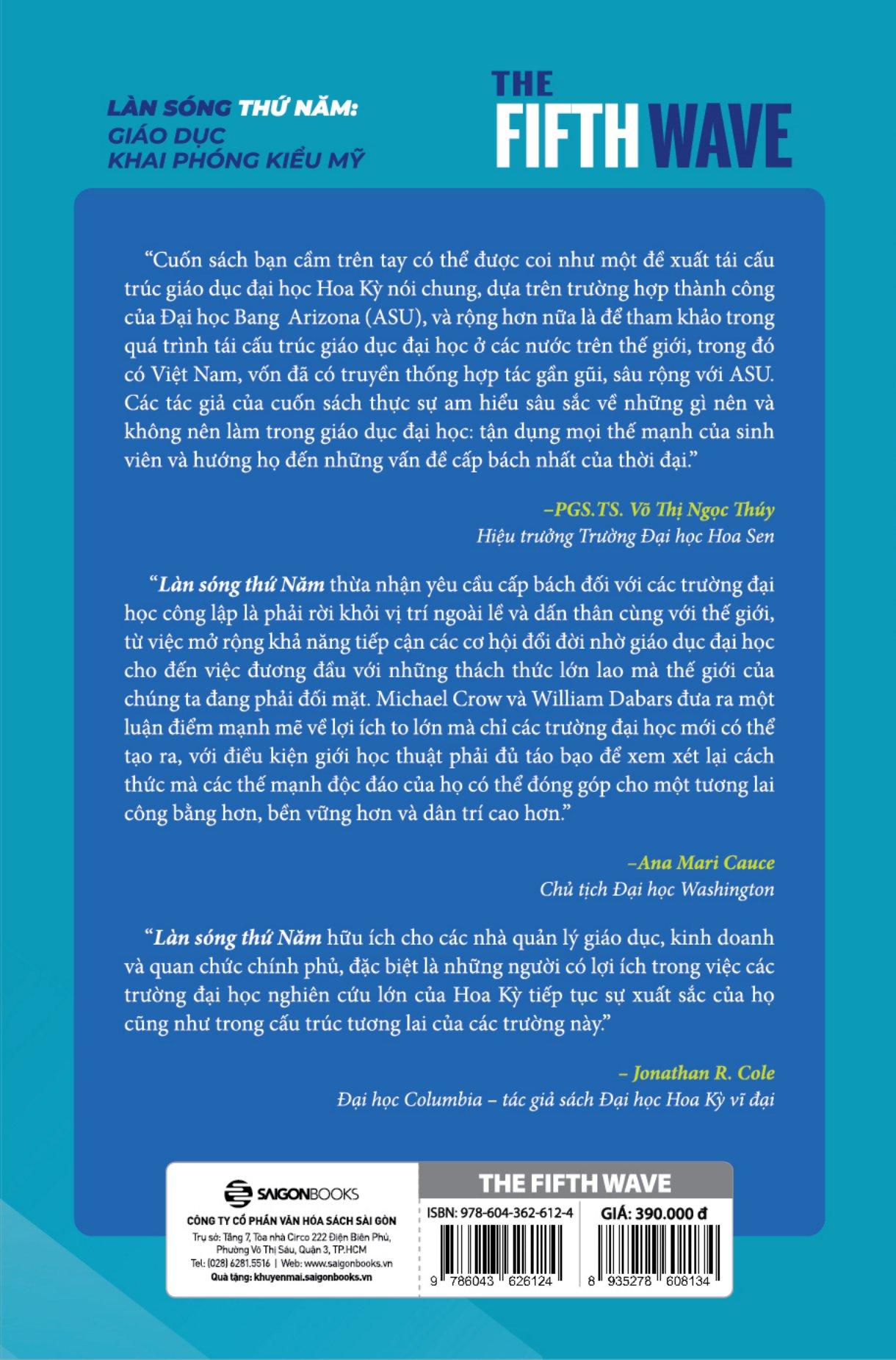 Làn Sóng Thứ Năm: Giáo Dục Khai Phóng Kiểu Mỹ có thể được coi như một đề xuất tái cấu trúc giáo dục đại học Hoa Kỳ nói chung, dựa trên trường hợp thành công của Đại học Bang Arizona, và rộng hơn nữa là để tham khảo trong quá trình tái cấu trúc giáo dục đại học ở các nước trên thế giới, trong đó có Việt Nam, vốn đã có truyền thống hợp tác gần gũi, sâu rộng với ASU. Các tác giả của cuốn sách thực sự am hiểu sâu sắc về những gì nên và không nên làm trong giáo dục đại học: tận dụng mọi thế mạnh của sinh viên và hướng họ đến những vấn đề cấp bách nhất của thời đại.