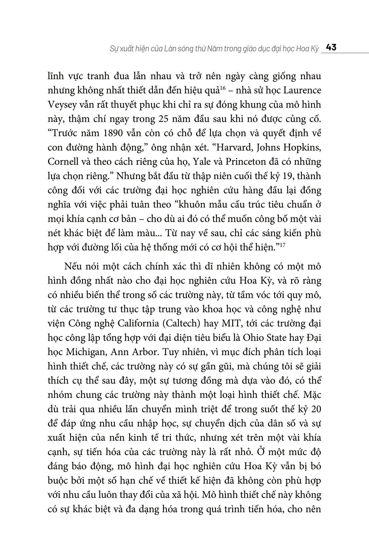Về mặt tên gọi, Crow và Dabars phân chia lịch sử giáo dục đại học Hoa Kỳ thành các làn sóng nối tiếp nhau từ các trường thời lập quốc (Làn sóng thứ Nhất) cho đến các trường đại học nghiên cứu (Làn sóng thứ Tư), và Làn sóng thứ Năm đang dần hình thành sẽ bao gồm một liên minh các trường cao đẳng và đại học có mong muốn mang lại tác động tích cực cho xã hội thông qua sự tích hợp liền mạch giữa sản xuất tri thức đẳng cấp thế giới và đổi mới công nghệ. Các trường thuộc Làn sóng thứ Năm như Đại học Bang Arizona đã bắt đầu mở rộng mạng lưới bao gồm học viện, doanh nghiệp, các cơ quan chính phủ, phòng thí nghiệm và các tổ chức xã hội dân sự. Tập hợp các thiết chế này ưu tiên tiếp cận nhóm nhân khẩu học rộng nhất có thể, đại diện cho các thành phần kinh tế xã hội và trí tuệ đa dạng trong xã hội.