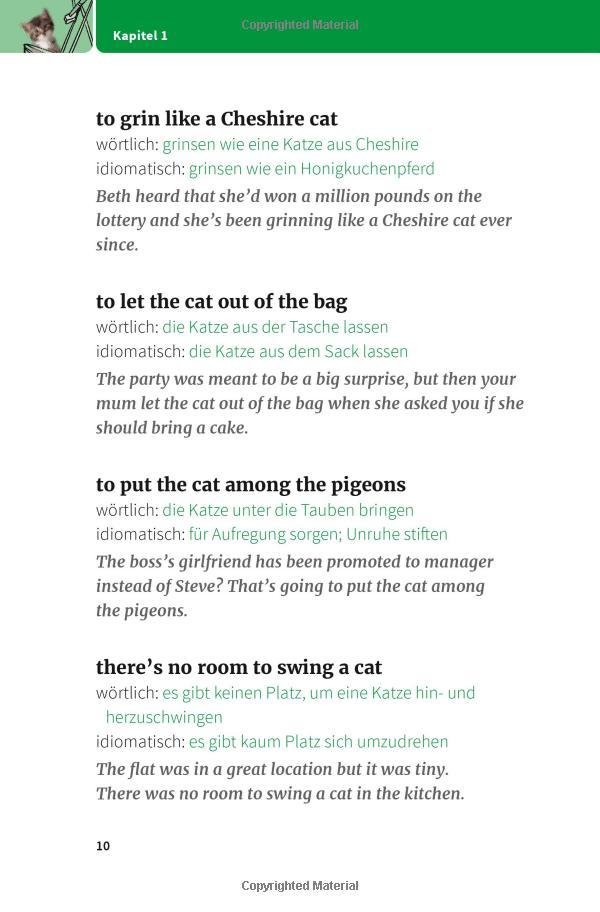 Jede Redewendung mit wörtlicher und idiomatischer Übersetzung sowie einem Anwendungsbeispiel