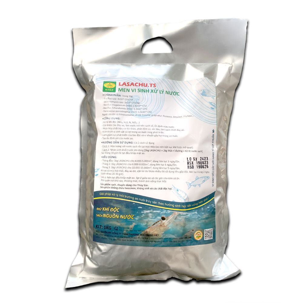 Mua tại TiktokChế phẩm vi sinh xử lý môi trường ao nuôi Thủy sản VI SINH SIÊU CẤP ! PHÂN GIẢI ĐỘC TỐC. ỔN ĐỊNH MÀU NƯỚC ! Chế phẩm sinh học Lasachu là dòng chế phẩm xử lý môi trường ao nuôi cho Thủy sản cao cấp nhất hiện nay. Đây là đề tài nguyên cứu của các giảng viên, chuyên gia Nông nghiệp hàng đầu của Trường Đại học Nông nghiệp 1 Hà Nội. Trong Chế phẩm này có tổng hợp hàng ngàn tỷ các chủng vi khuẩn có lợi giúp phân giải các tạp chất khó tan thành dễ tan, phân giải độc tố, ổn định màu nước, cân bằng pH và bổ sung dinh dưỡng cho môi trường ao nuôi. [ 1 gói Chế phẩm xử lý tới 5000m3 diện tích ao nuôi ] Vi sinh xử lý ao nuôi tôm, cá LASACHU Thành phần:
