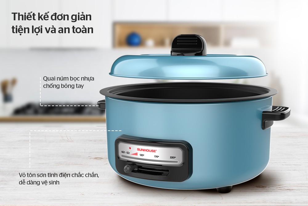 Nồi lẩu điện SUNHOUSE SHD4527 có thân nồi làm từ chất liệu tôn sơn tĩnh điện, có khả năng chịu nhiệt cao và ít bị ảnh hưởng bởi môi trường. Đây cũng là chất liệu không bong tróc, dễ dàng vệ sinh, tiết kiệm thời gian cho người sử dụng. Màu xanh ngọc trang nhã, tinh tế, làm tôn lên vẻ đẹp cho căn bếp của gia đình bạn.