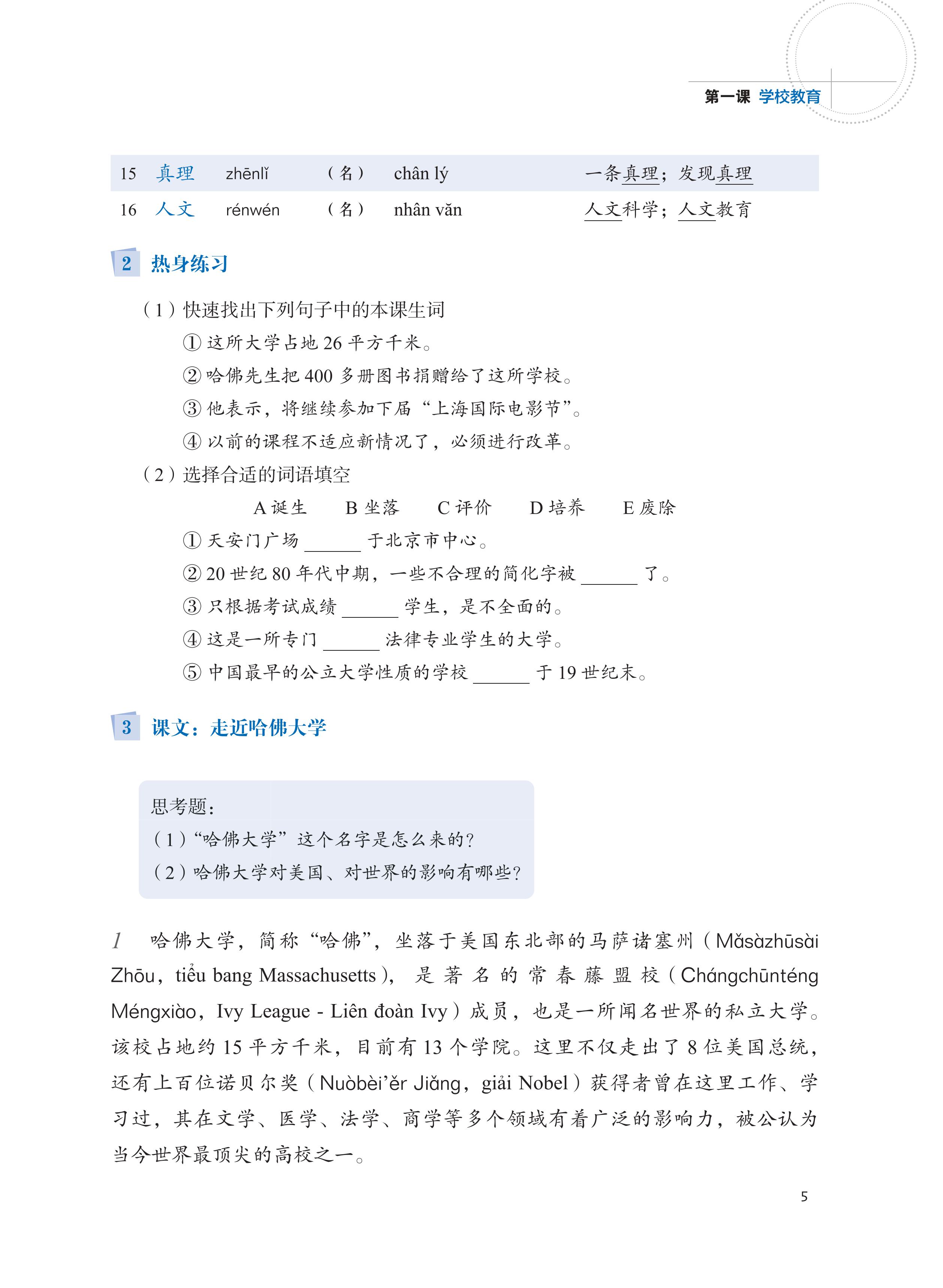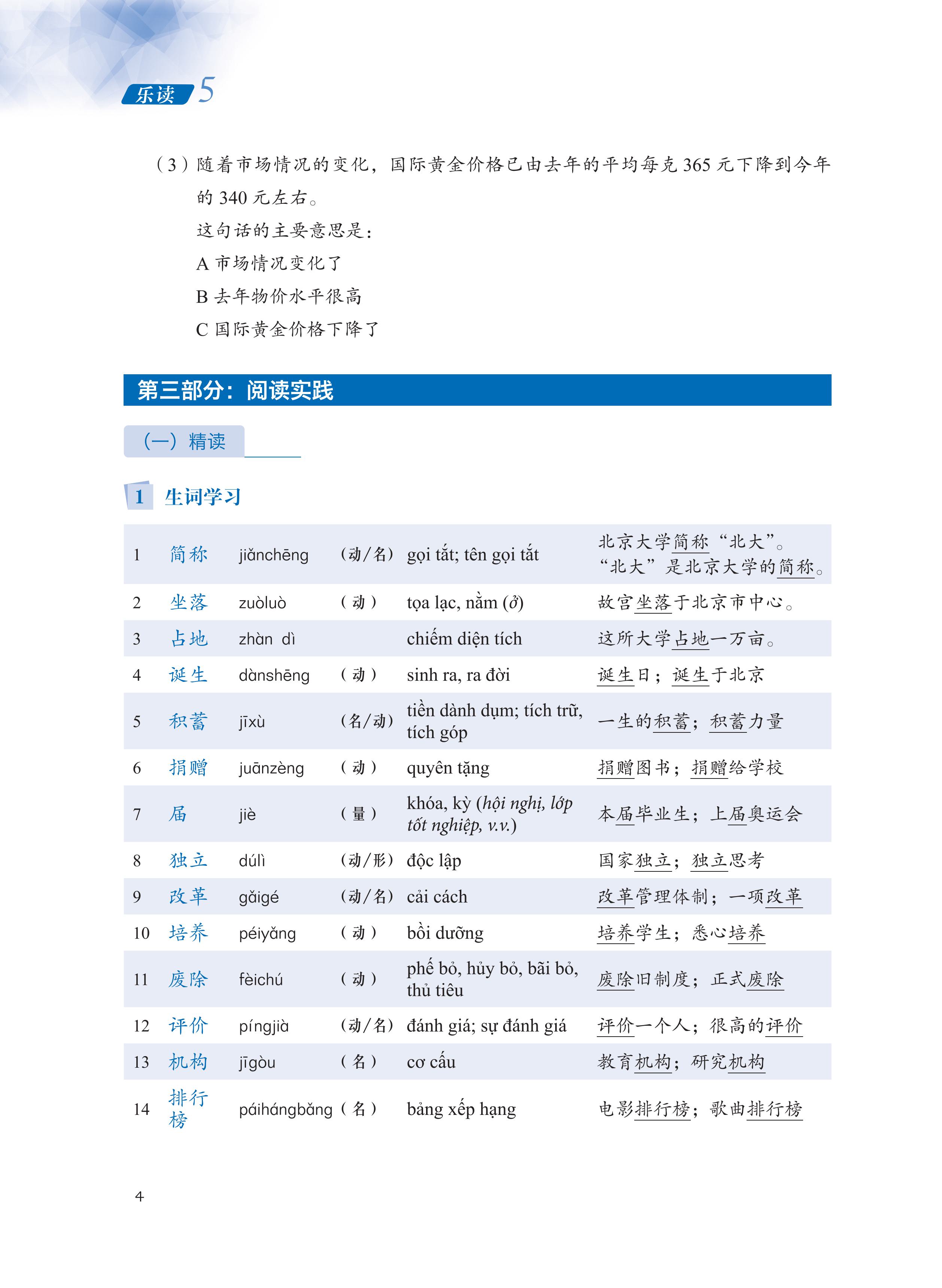 Thực tiễn đọc hiểu: Đây là phần quan trọng nhất của mỗi bài, do ba bộ phận tạo thành là đọc chuyên sâu, đọc mở rộng và đọc thực tế. Bài khóa ở mỗi bộ phận có chủ đề thống nhất nhưng góc độ khác nhau, ba bài khóa có độ khó giảm dần, chú trọng sự tái hiện của từ mới khi biên soạn bài khóa. Ba bộ phận của phần “Thực tiễn đọc hiểu” ngoài bài khóa còn phối hợp với bài tập có liên quan, chủ yếu bao gồm luyện tập đọc hiểu chữ, từ và câu trọng điểm, đồng thời rút ra và khái quát cấu trúc của bài văn, v.v. Tất cả bài tập đều dùng để kiểm tra và củng cố việc lý giải bài khóa của học sinh. Tóm lại, trong quá trình biên soạn, quyển giáo trình này cố gắng đạt đến mục đích lớp lang và trình tự rõ ràng, tiện cho việc sử dụng.