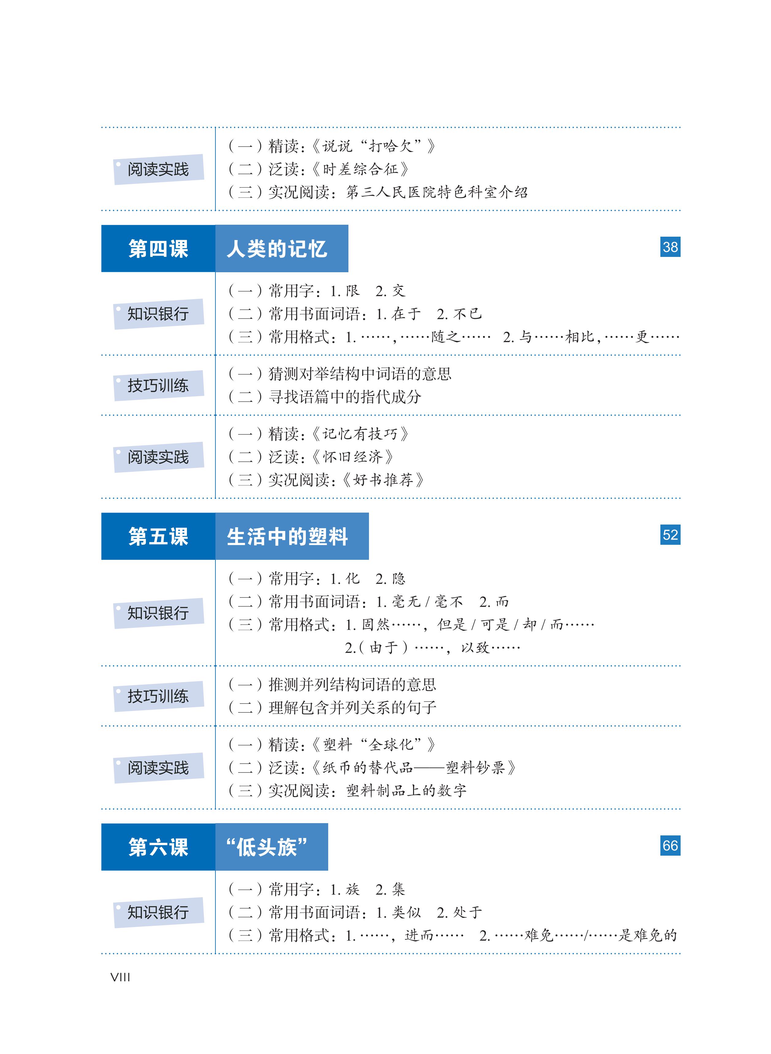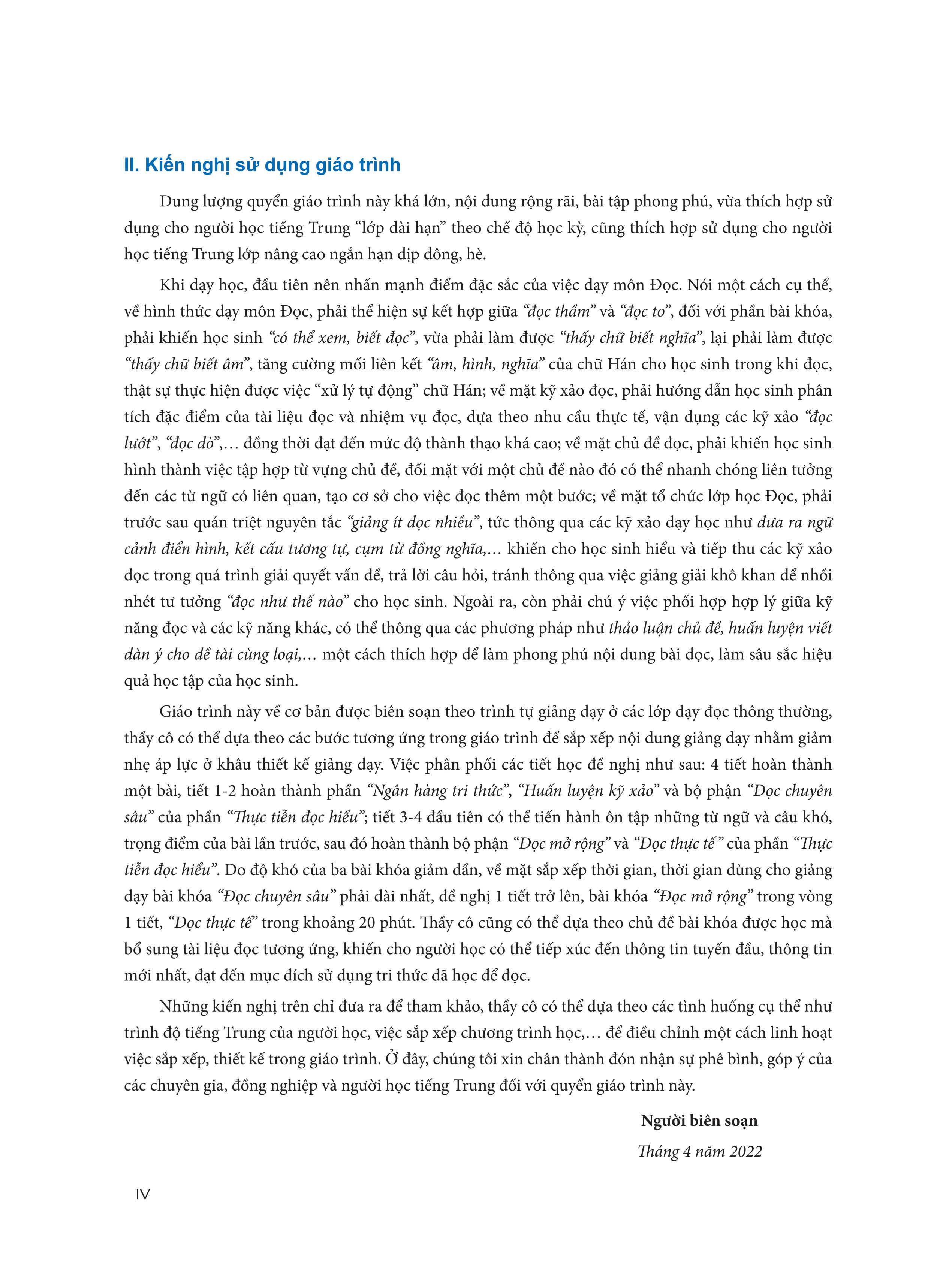 Giáo trình này về cơ bản được biên soạn theo trình tự giảng dạy ở các lớp dạy đọc thông thường, thầy cô có thể dựa theo các bước tương ứng trong giáo trình để sắp xếp nội dung giảng dạy nhằm giảm nhẹ áp lực ở khâu thiết kế giảng dạy. Việc phân phối các tiết học đề nghị như sau: 4 tiết hoàn thành một bài, tiết 1-2 hoàn thành phần “Ngân hàng tri thức”, “Huấn luyện kỹ xảo” và bộ phận “Đọc chuyên sâu” của phần “Thực tiễn đọc hiểu”; tiết 3-4 đầu tiên có thể tiến hành ôn tập những từ ngữ và câu khó, trọng điểm của bài lần trước, sau đó hoàn thành bộ phận “Đọc mở rộng” và “Đọc thực tế ” của phần “Thực tiễn đọc hiểu”. Do độ khó của ba bài khóa giảm dần, về mặt sắp xếp thời gian, thời gian dùng cho giảng dạy bài khóa “Đọc chuyên sâu” phải dài nhất, đề nghị 1 tiết trở lên, bài khóa“Đọc mở rộng” trong vòng 1 tiết, “Đọc thực tế” trong khoảng 20 phút. Thầy cô cũng có thể dựa theo chủ đề bài khóa được học mà bổ sung tài liệu đọc tương ứng, khiến cho người học có thể tiếp xúc đến thông tin tuyến đầu, thông tin mới nhất, đạt đến mục đích sử dụng tri thức đã học để đọc.
