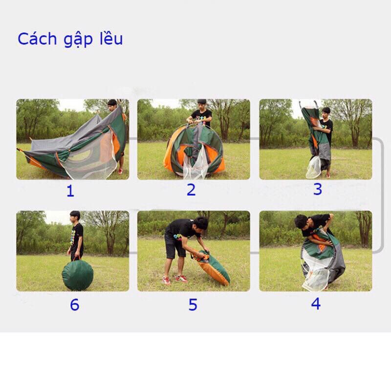 Kích thước: 2m x 1.5m x 1.4m Khung lều làm từ sợi thủy tinh tổng hợp có dẻo dai tạo độ bền sử dụng lâu dài cho sản phẩm Mặt ngoài lều được tráng 1 lớp bạc giúp chống tia tử ngoại rất tốt Thiết kế nhỏ gọn, sức chứa 2-3 người giúp bạn dễ dàng mang theo Đường chỉ may cẩn thận, chắc chắn Lều có sẵn các phụ kiện cố định lều xuống đất khi thời tiết có gió to  Cửa sổ lưới kéo bên trong Tháo lắp dễ dàng, nhanh chóng Khả năng kháng nước và chịu lực tốt . Thích hợp cho 2-3 người sử dụng Cách lắp đặt Lều Cắm Trại Lều Du Lịch Tự Bung Gấp Gọn Chống Nước 4-6 Người ( 2 X 1.5 X 1,35 m) : Trải lều ra trên mặt đất bằng phẳng Nối các thanh rời thành 2 thanh dài sau đó luồn qua đường may sẵn hình chữ X Tại 4 góc lều tra đầu thanh vào lỗ nhựa ở các góc Buộc dây ở đỉnh lều để đỉnh lều cố định Cắm đinh vào 4 góc lều để cố định lều