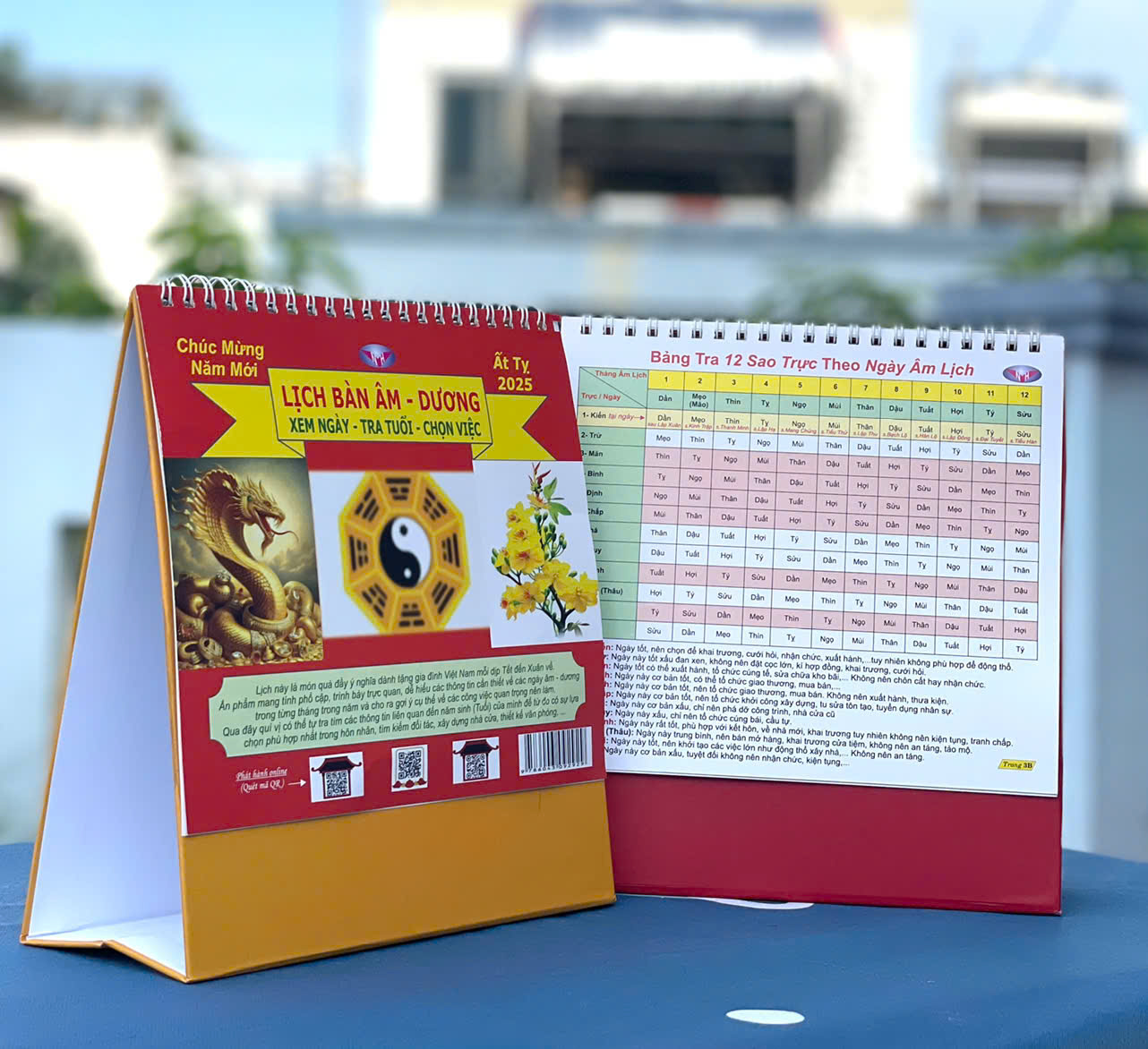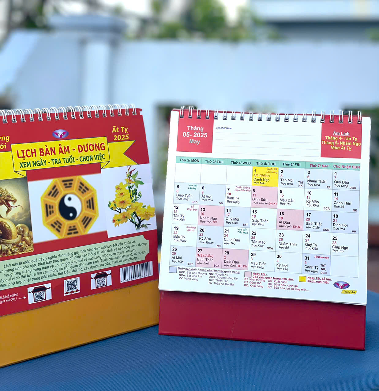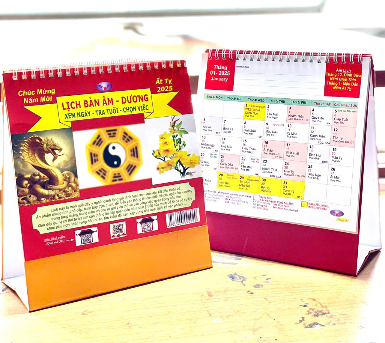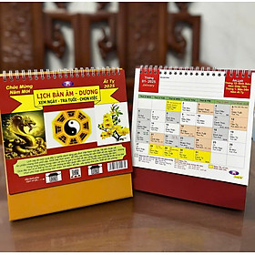 Lịch bàn khổ 19x17 (cm), gồm 26 trang (in 2 mặt) có đầy đủ thông tin về ngày âm - dương , giúp chọn được ngày tốt, hạn chế ngày xấu, ...Đế lịch chữ A, KT 19x21 (cm), có 2 màu tùy chọn: Đỏ và Vàng san...