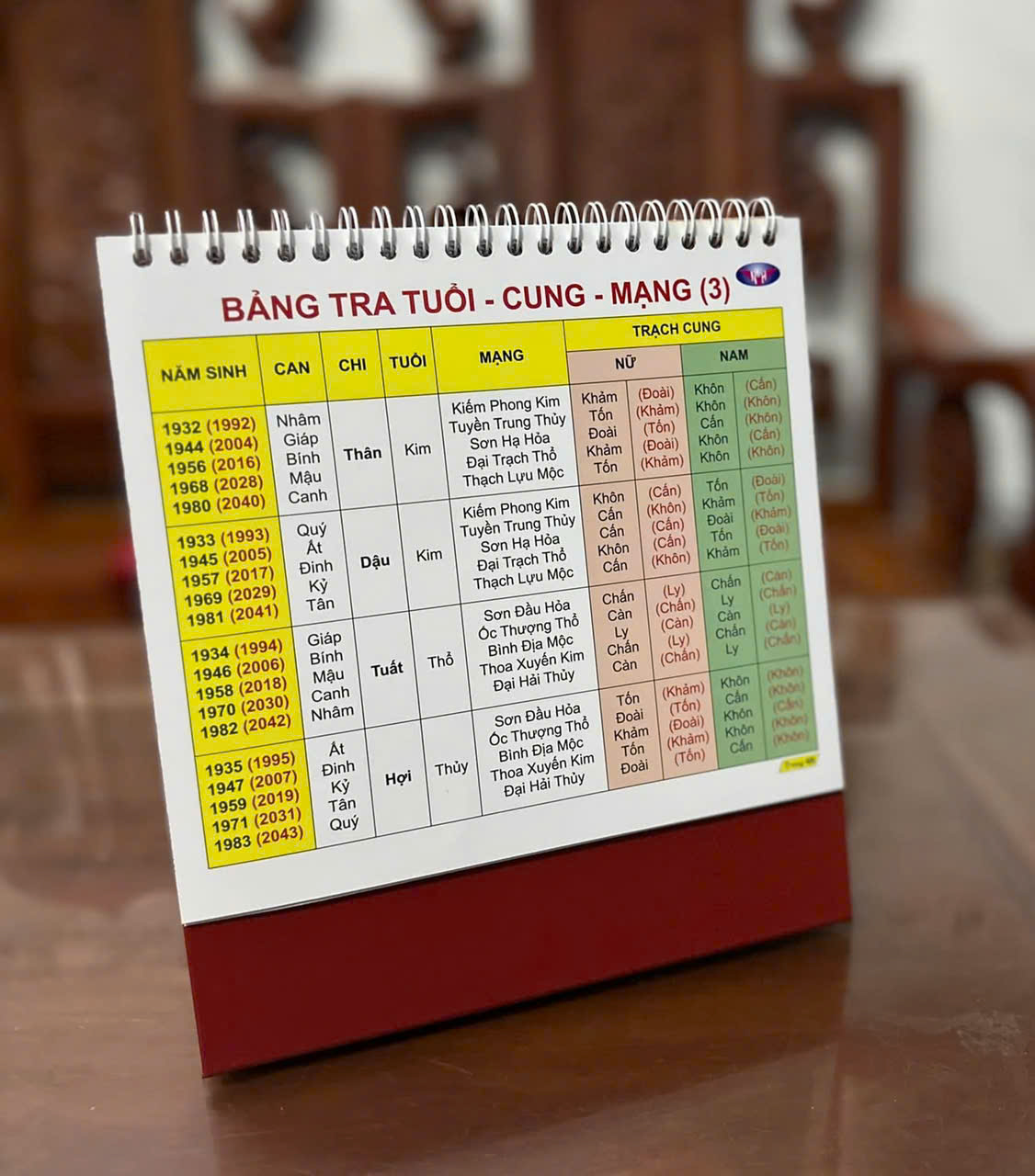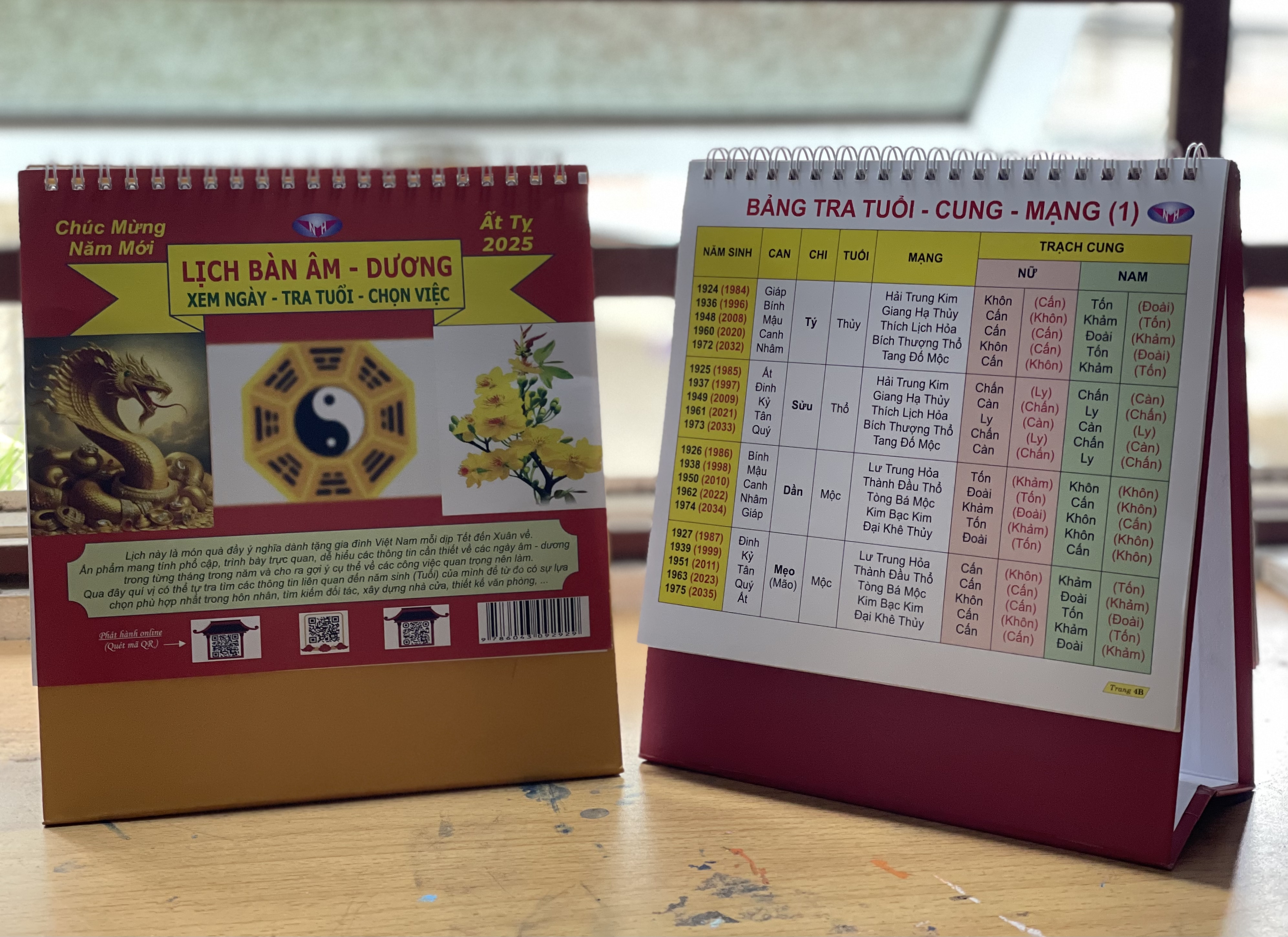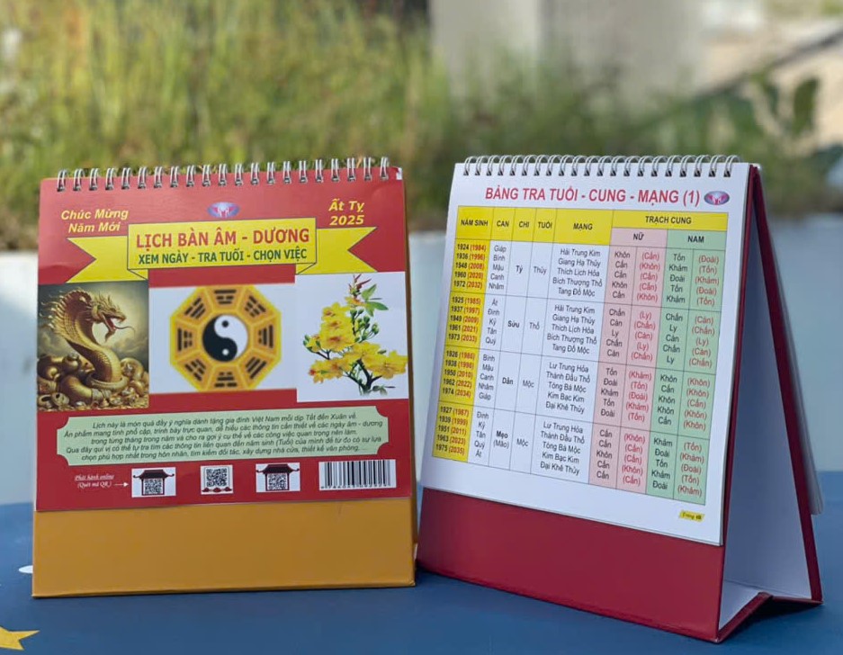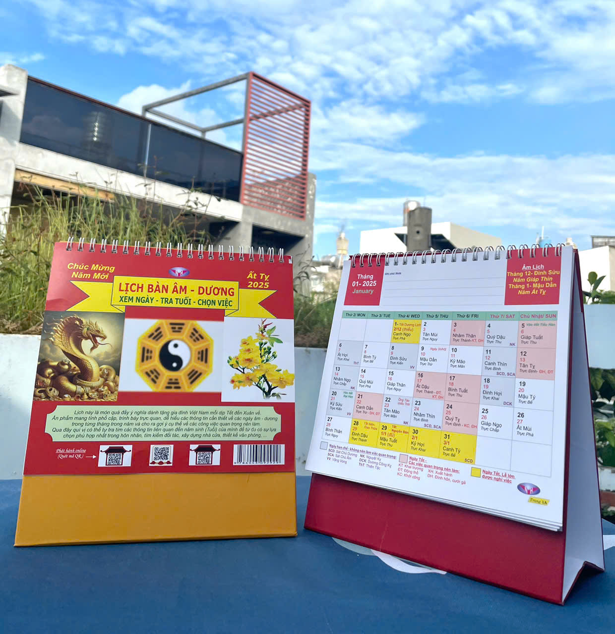 Lịch bàn khổ 19x17 (cm), gồm 26 trang (in 2 mặt) có đầy đủ thông tin về ngày âm - dương , giúp chọn được ngày tốt, hạn chế ngày xấu, ...Đế lịch chữ A, KT 19x21 (cm), có 2 màu tùy chọn: Đỏ và Vàng san...