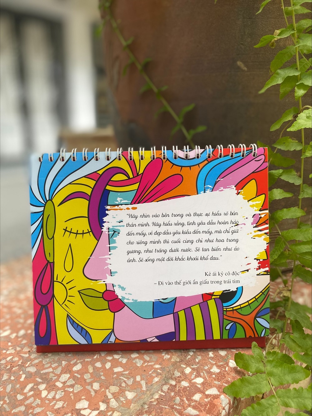 Bên trong bộ lịch kèm những hình ảnh minh họa hấp dẫn từ những cuốn sách hay mọi chủ đề về kỹ năng, tâm lý và giao tiếp… Bên cạnh đó là những câu trích dẫn mang thông điệp ý nghĩa về cuộc sống, về tình yêu, về gia đình, về hạnh phúc, hay sự yêu thương, đùm bọc và chở che lẫn nhau… tiếp thêm động lực cho bản thân để hoàn thành mục tiêu dự định trong tương lai.