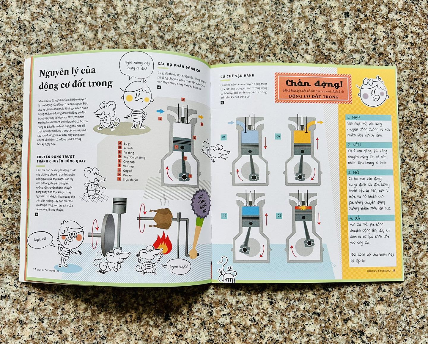 Mua tại TiktokLỊCH SỬ CHẾ TẠO XE HƠI Hơn 5.000 năm trước loài người phát minh ra bàn xoay gốm; phát minh tưởng như không mấy liên quan này đánh dấu một điều khiến cho trái tim loài người đập nhanh hơn đôi chút: chiếc xe kéo đầu tiên, động cơ hơi nước đánh dấu sự ra đời của xe hơi, chiếc xe với động cơ đốt trong, rồi đến mẫu xe hiện đại của điệp viên James Bond và Người Dơi. Con người chưa bao giờ ngừng nghỉ trên chặng đường chinh phục tốc độ!Tất cả đang chờ bạn với ngập tràn hình minh họa độc đáo và đậm chất cổ điển. Tựa sách dành cho các bạn nhỏ từ 8-15 tuổi đam mê tìm hiểu cấu tạo và cách thức hoạt động của các loại máy móc, phương tiện .