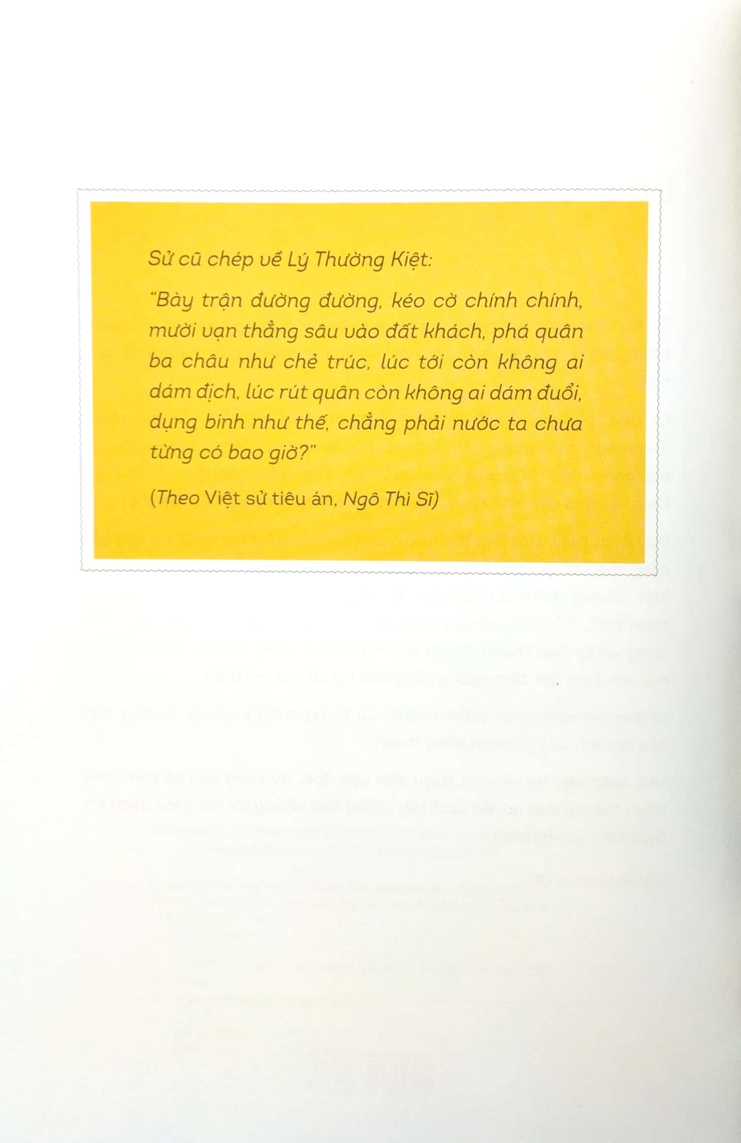 Sử cũ chép về Lý Thường Kiệt: “Bày trận đường đường, kéo cờ chính chính, mười vạn thẳng sâu vào đất khách, phá quân ba châu như chẻ trúc, lúc tới còn không ai dám địch, lúc rút quân còn không ai dám đuổi, dụng binh như thế, chẳng phải nước ta chưa từng có bao giờ?”