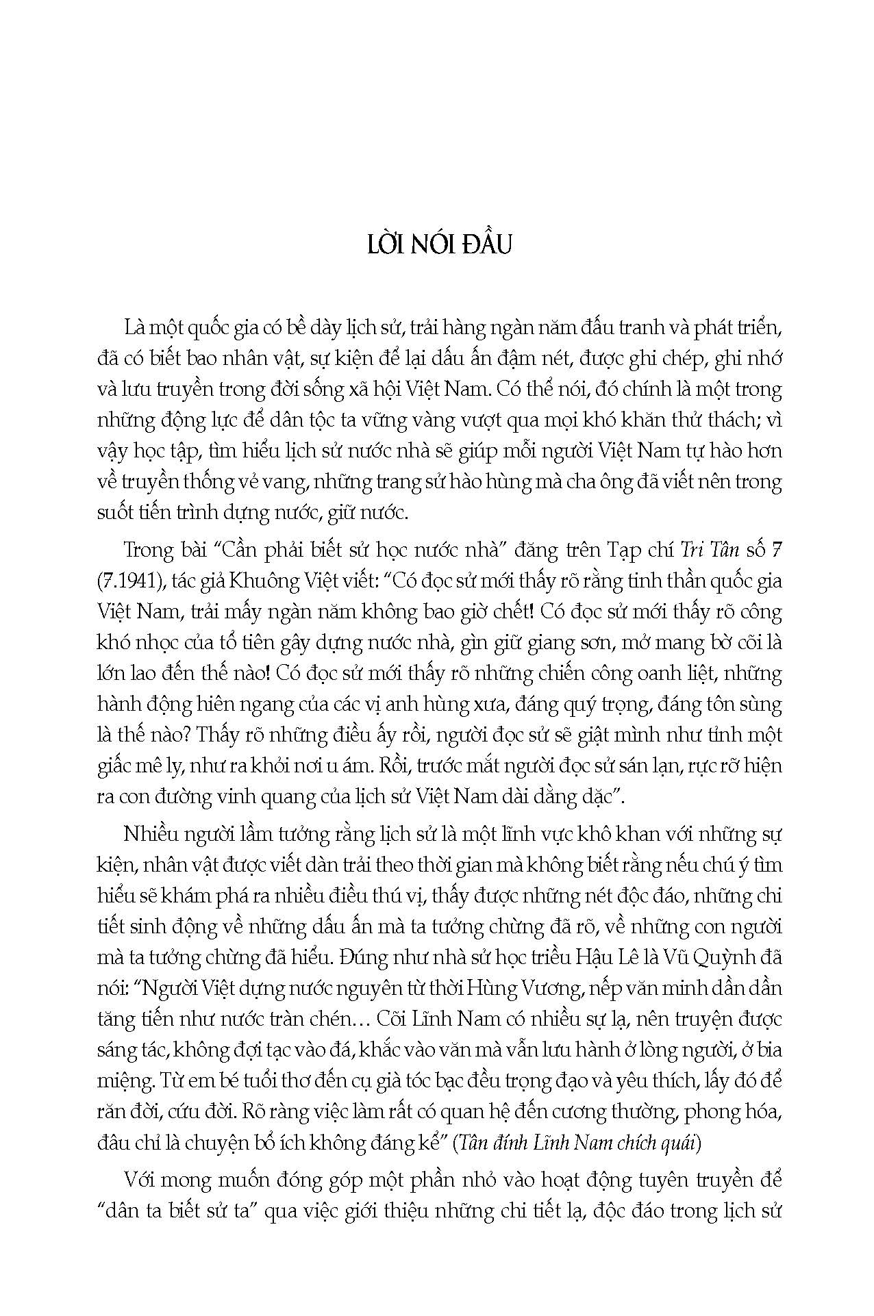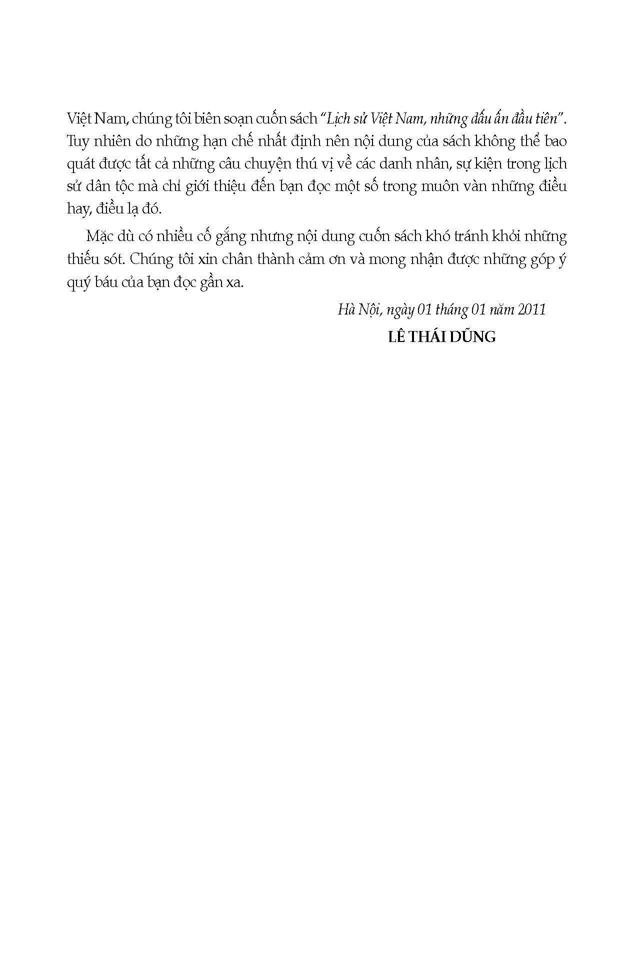 Là một quốc gia có bề dày lịch sử, trải hàng ngàn năm đấu tranh và phát triển, Việt Nam đã có biết bao nhân vật, sự kiện để lại dấu ấn đậm nét, được ghi chép, ghi nhớ và lưu truyền trong đời sống xã hội. Nhằm góp phần vào hoạt động tuyên truyền “dân ta biết sử ta”, cuốn sách “Lịch Sử Việt Nam – Những Dấu Ấn Đầu Tiên” giới thiệu những dấu ấn đáng ghi nhớ trong lịch sử Việt Nam, với những câu chuyện thú vị về các danh nhân, sự kiện trong lịch sử dân tộc, giúp tìm hiểu lịch sử nước nhà, tự hào về truyền thống vẻ vang, những trang sử hào hùng mà ông cha đã viết nên trong suốt tiến trình dựng nước, giữ nước.