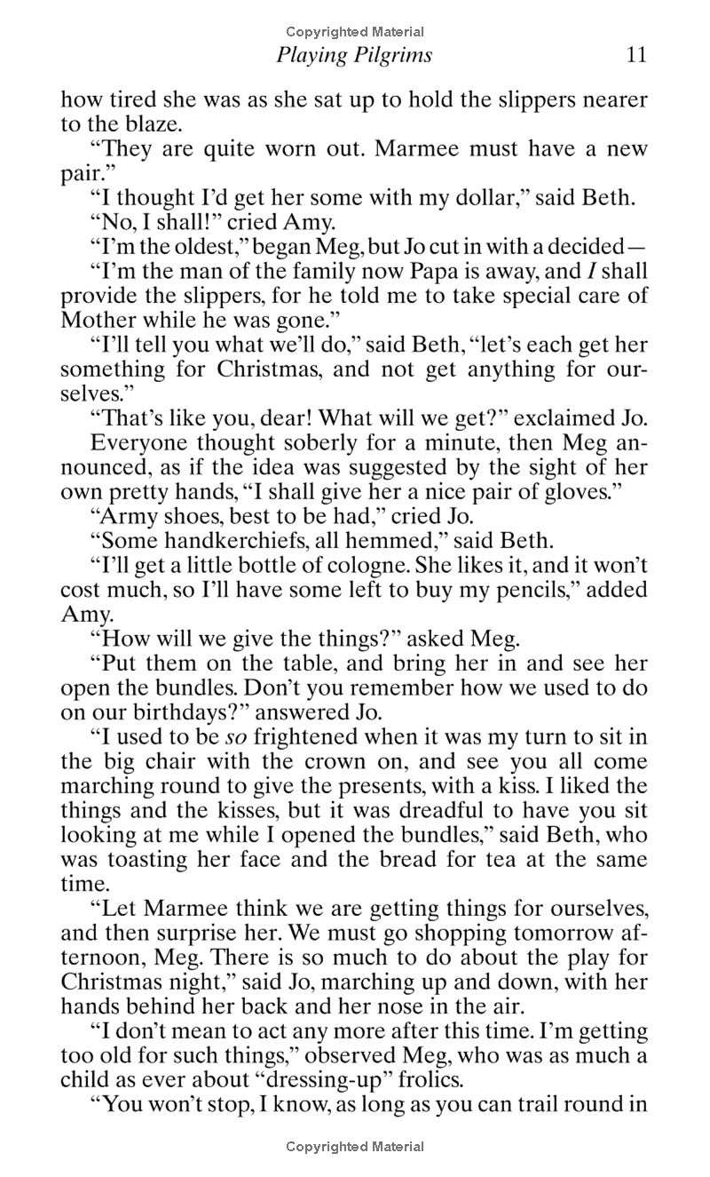 The four March sisters--Meg, Amy, Beth, and feisty Jo--share the joys and sorrows of growing up while their father is away at war. The family is poor in worldly goods, but rich in love and