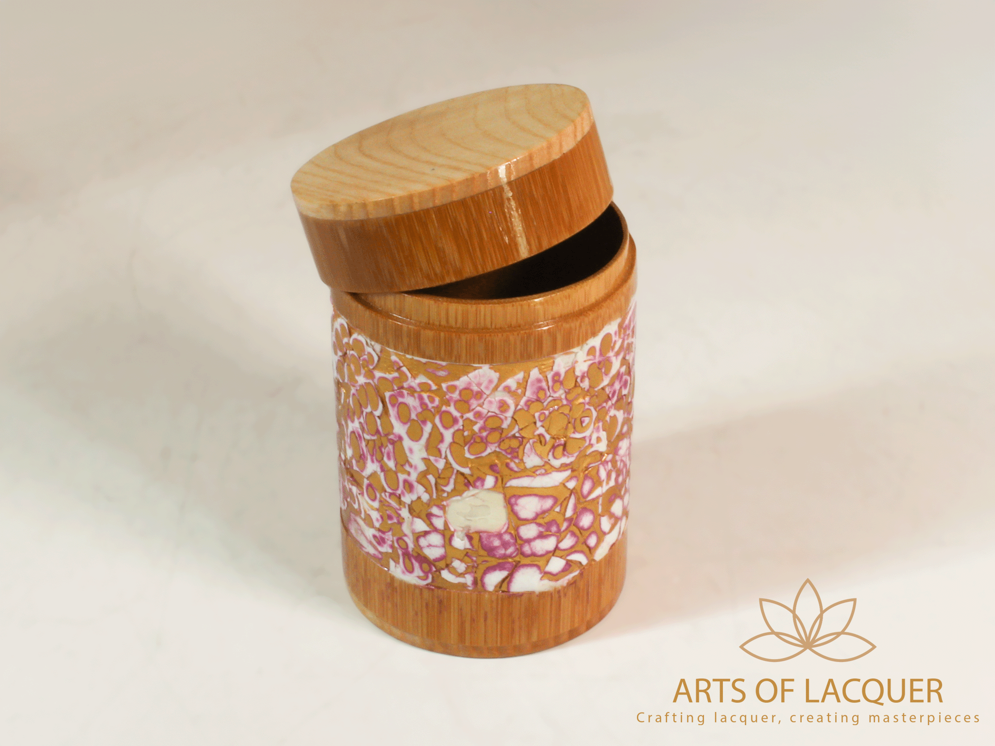 Sản phẩm trong hình là "Lọ Tre Sơn Mài Khảm Trai Tím" từ Arts of Lacquer. Hộp có thiết kế tròn với nền màu vàng nhạt và tím, được trang trí bằng hoa văn tinh