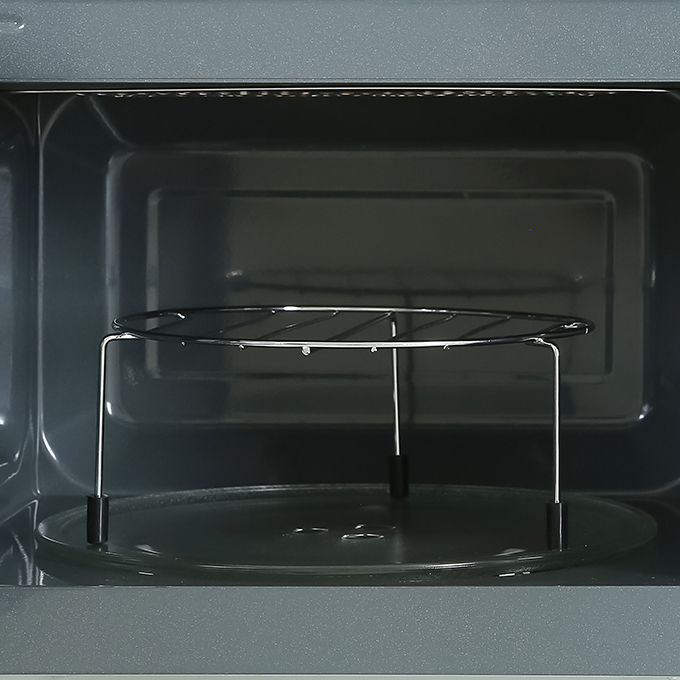 Lò vi sóng có nướng với khoang lò bằng thép không gỉ, cửa kính dáng bóng giúp nấu nướng thực phẩm an toàn, dễ lau chùi đảm bảo vệ sinh. Đĩa xoay tròn và giá nướng cho món ăn chín đều, ngon hơn, lò có đèn chiếu sáng giúp bạn dễ quan sát quá trình thức ăn được chế biến khi lò đang hoạt động.
