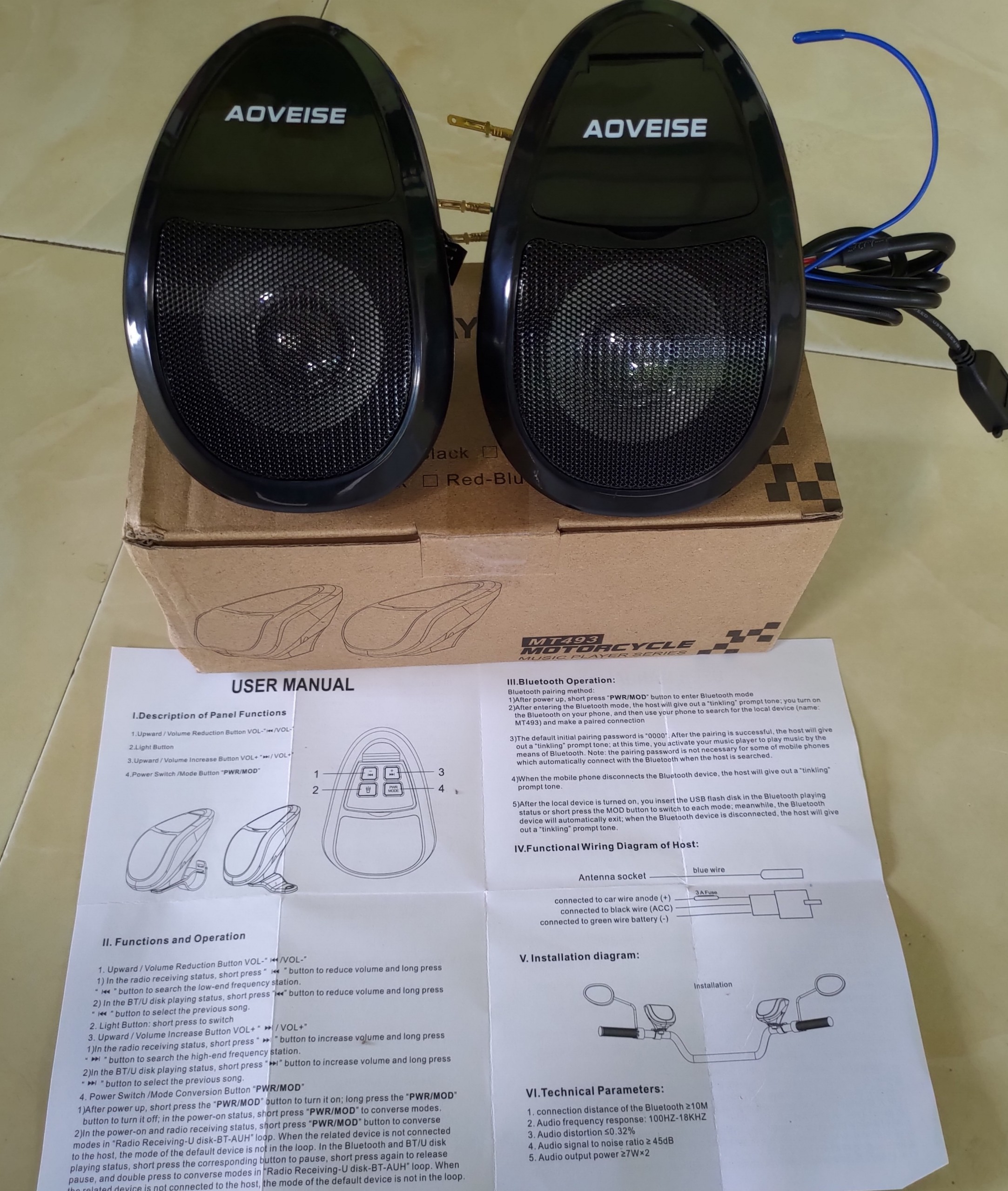 Thông số kỹ thuật: AOVEISE Mẫu số: MT493 Mô hình áp dụng: Thích hợp cho xe máy với khẩu độ 10 mm gương Màu: Tất cả màu đen Kích thước: 120 x 85 x 70 mm/4,72 x 3,35 x 2,76 inch Trọng lượng: 660 g công xuất ; 15w x 2 Sử dụng: Chơi nhạc nghe FM