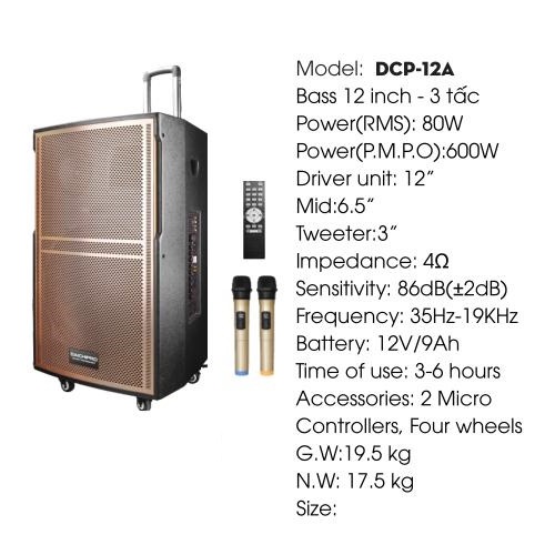 Loa Kéo Di Động Karaoke Bass 30 Daichipro DCP-12A (600W) 3 Tấc - Chính Hãng với công suất loa bass 30cm (3 tấc) lớn 600W bạn có thể sử dụng liên tục trong nhiều giờ ngoài nguồn điện (sạc đầy lại khoảng 6 - 8 tiếng), rất thích hợp khi bạn muốn tổ chức các buổi tiệc ngoài trời cùng gia đình và bạn bè.