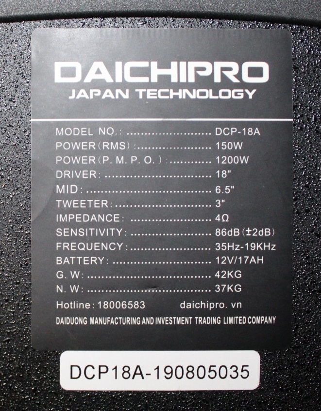Loa Kéo Di Động Karaoke Bass 50 Daichipro DCP-18A (1200W) 5 Tấc - Chính Hãng với công suất loa bass 50cm (5 tấc) lớn 1200W bạn có thể sử dụng liên tục trong nhiều giờ ngoài nguồn điện (sạc đầy lại khoảng 6 - 8 tiếng), rất thích hợp khi bạn muốn tổ chức các buổi tiệc ngoài trời cùng gia đình và bạn bè.